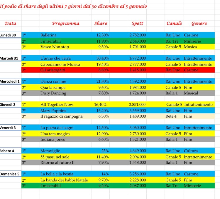 Analisi auditel dal 30 dicembre 2019 al 5 gennaio 2020.