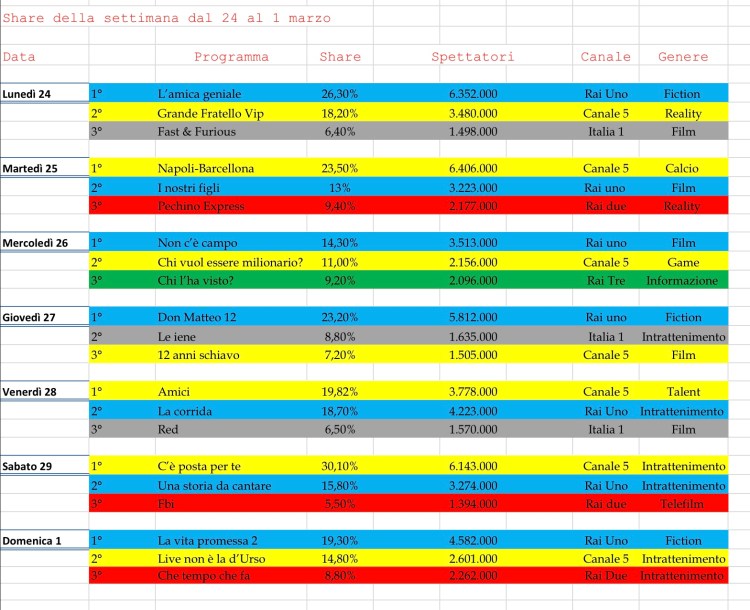 Ascolti della settimana dal 24 febbraio al 1 marzo con numeri abbastanza alti per tutte le reti.