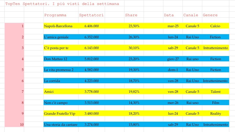 Mentre il Grande fratello Vip, promosso con un altro mese di messa in onda, lo troviamo al nono posto sebbene abbia portato a casa un discreto 3,4 milioni di spettatori.