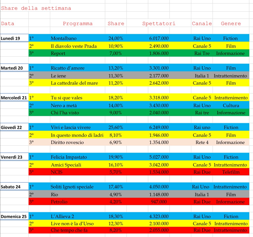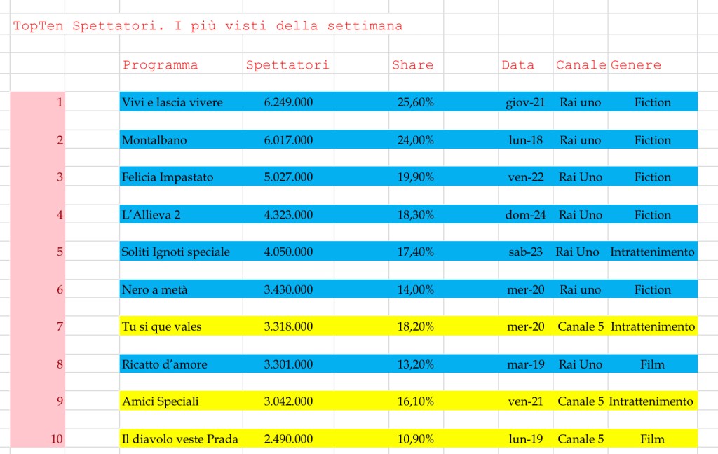 Rientriamo nei ranghi poi delle prima assoluta con Vivi e lascia vivere, la penultima puntata della fiction con Elena Sofia Ricci si posiziona prima con ben più di sei milioni di spettatori. Tallonata da Montalbano, ma ormai i suoi ascolti non fanno più notizia.