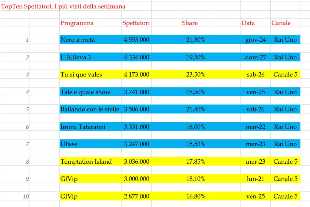 Nero a metà di conferma leader tra le prime Tv con più di 4,5 milioni di spettatori.