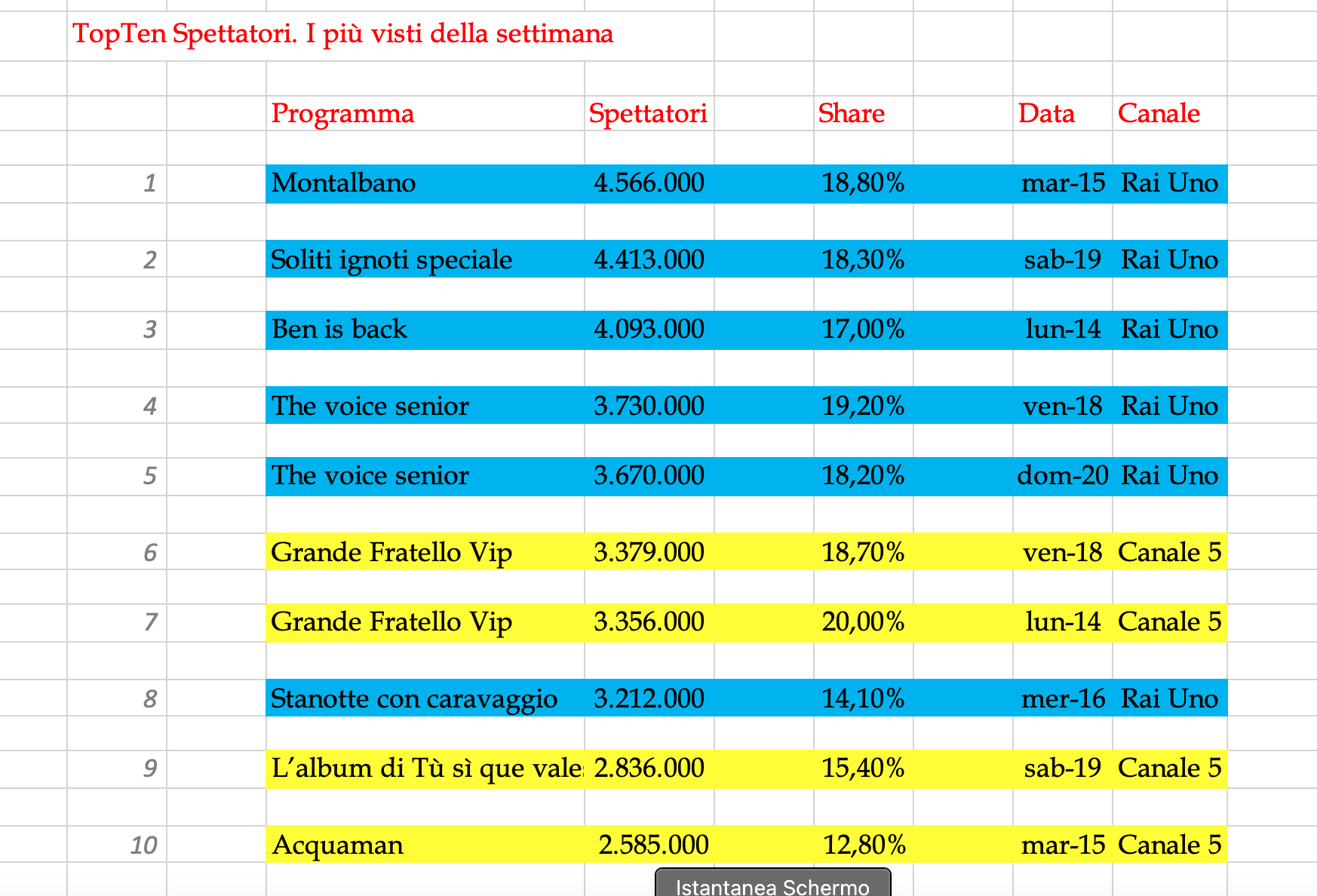 Alberto Angela arriva a 3,2 milioni di spettatori. Le ultime due posizioni della classifica sono occupate dal meglio di Tù sì que vales e il film Acquaman.