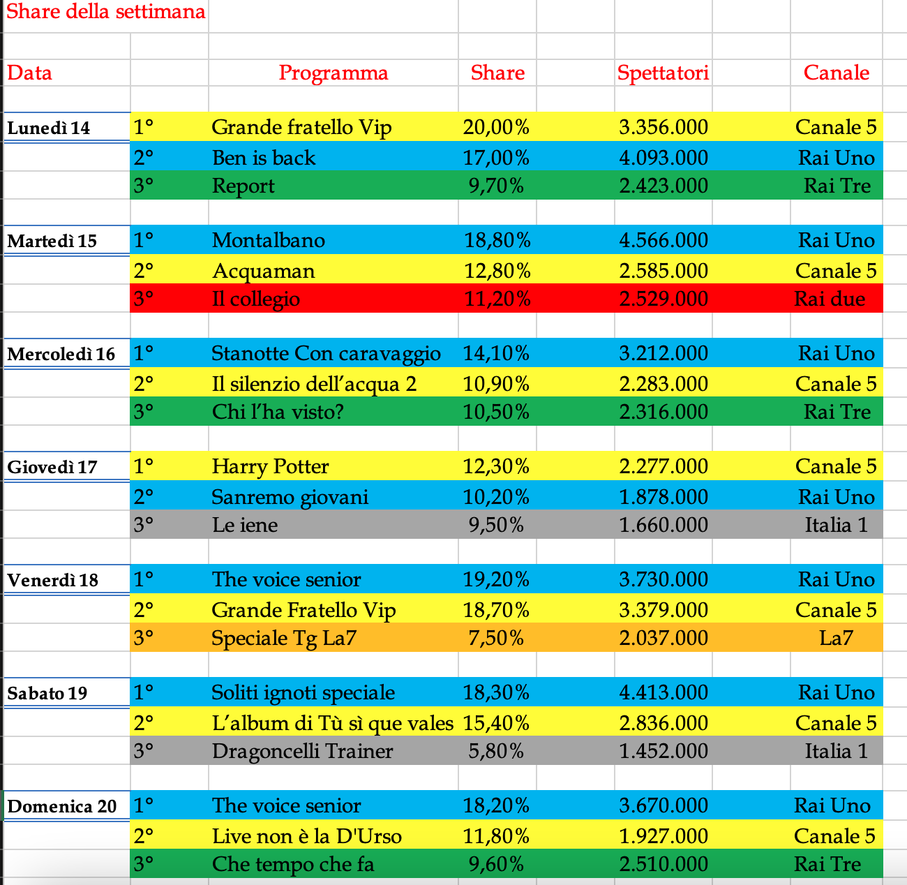 Per quanto riguarda il Day Time È sempre mezzogiorno conferma il suo trend positivo del 14%.