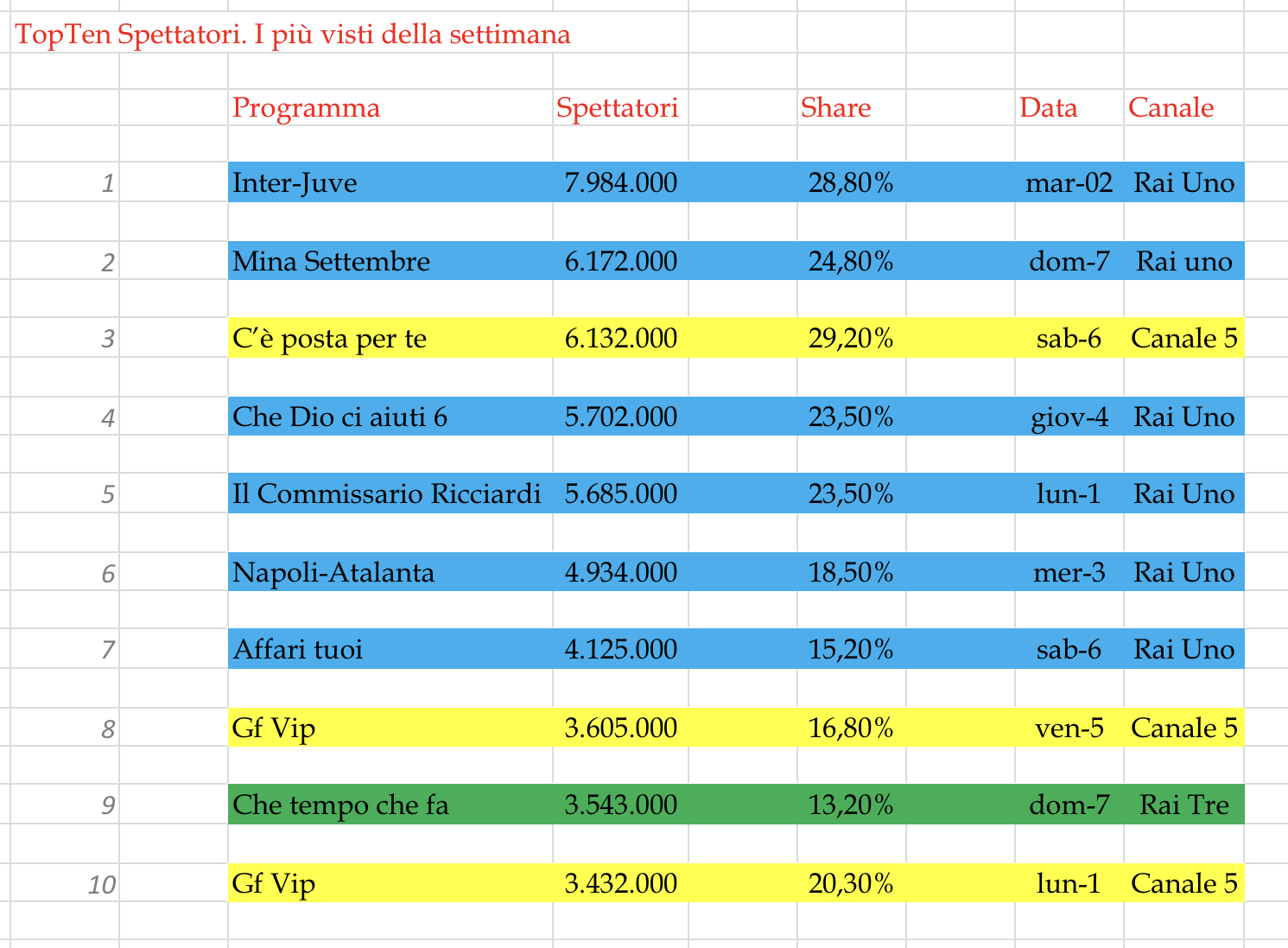 Questi primi due exploit relegano, se così si può dire, C’è posta per te al terzo posto della Top Ten con, comunque, più di sei milioni di spettatori.