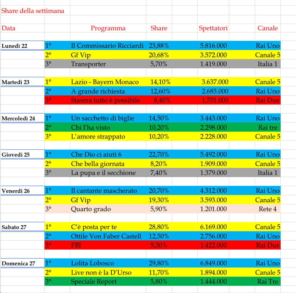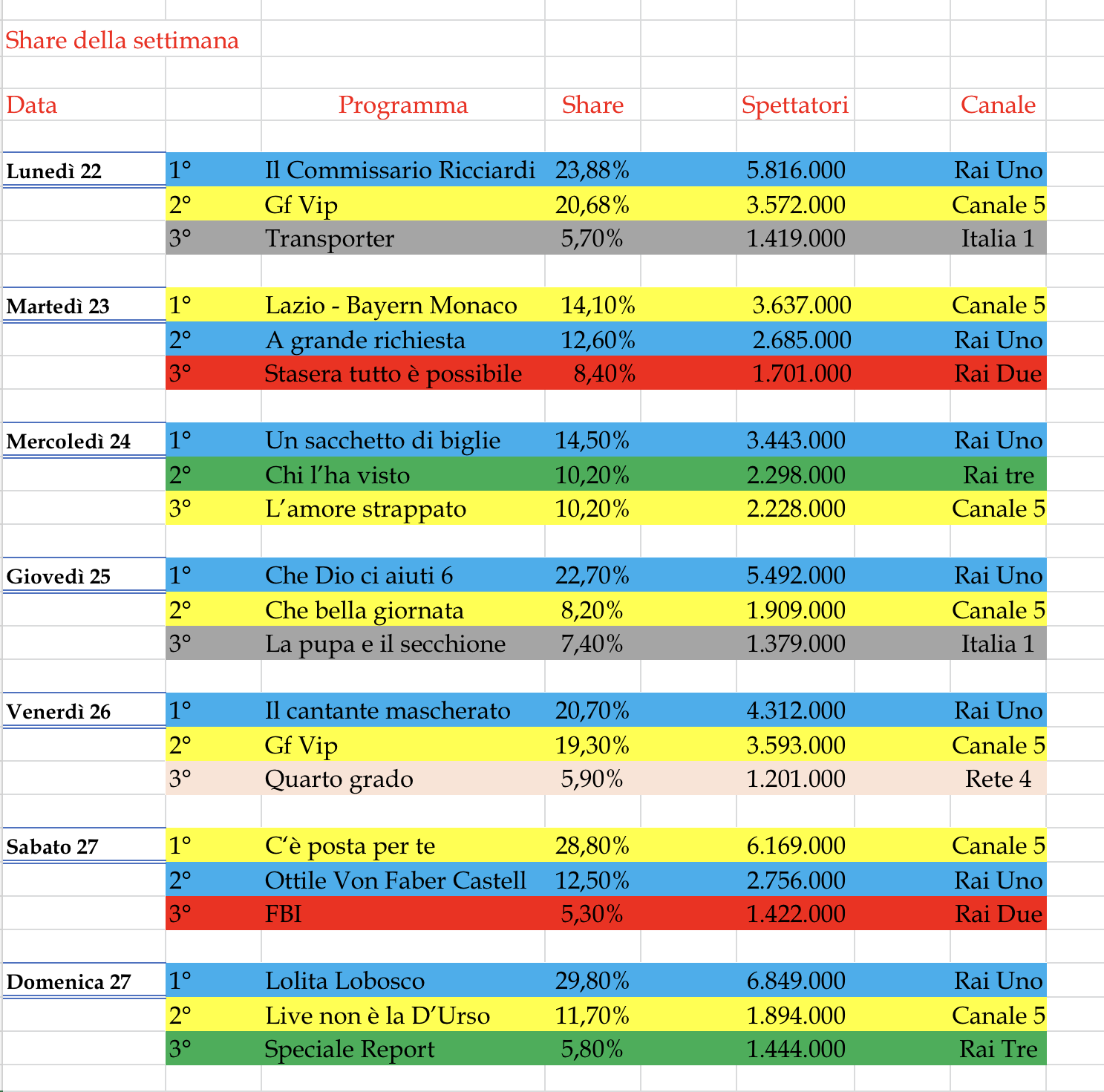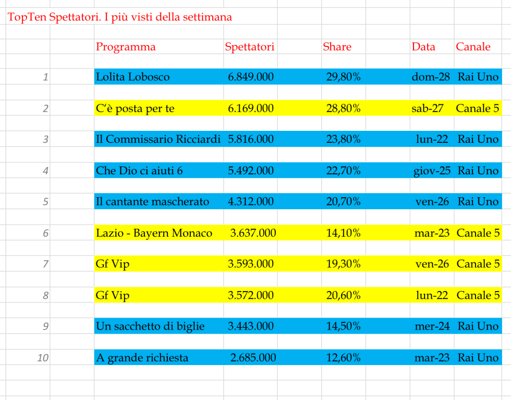 Al secondo posto troviamo C’è posta per te che si conferma leader del sabato sera. A seguire altre due grandi produzioni di Rai Fiction, Che Dio Ci Aiuti 6 e Il commissario Ricciardi, di cui è stata confermata la seconda stagione.