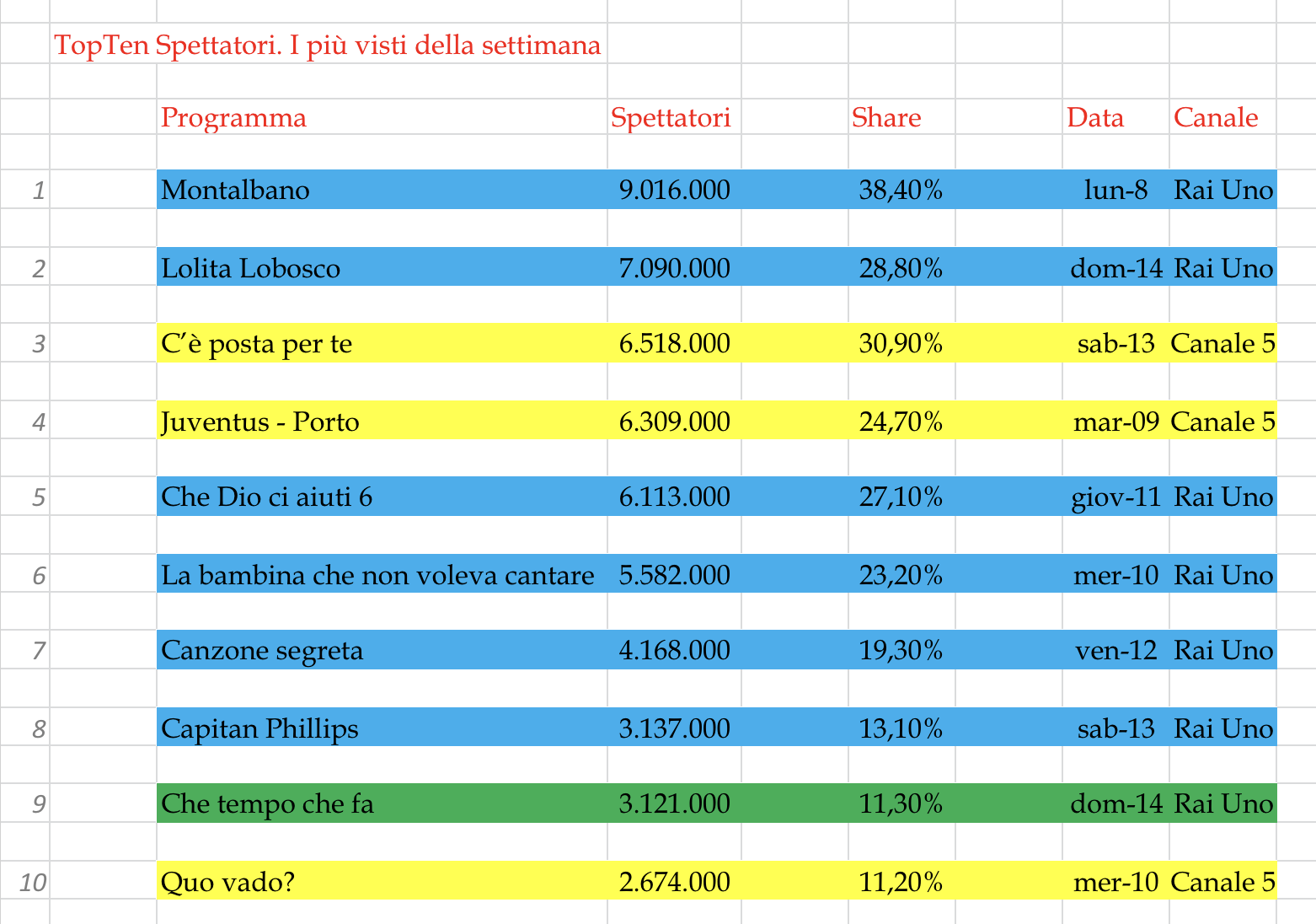 È forse utile soffermarci sul programma di intrattenimento di Rai Uno A grande richiesta, nonostante sia stato spostato al martedì (originariamente era di sabato), gli ascolti non sono aumentati più di tanto, eppure il potenziale c’era.