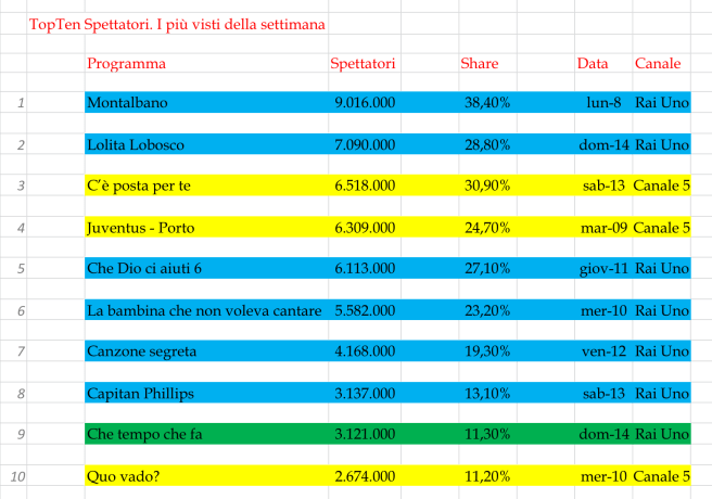 Spicca Montalbano, che non senza qualche polemica per la trama, porta a casa più di 9 milioni di spettatori con quello che forse potrebbe essere l’ultimo capitolo del Commissario più amato d’Italia. La sua degna erede, Lolita Lobosco, chiude la prima stagione con più di 7 milioni di persone davanti alla Tv.