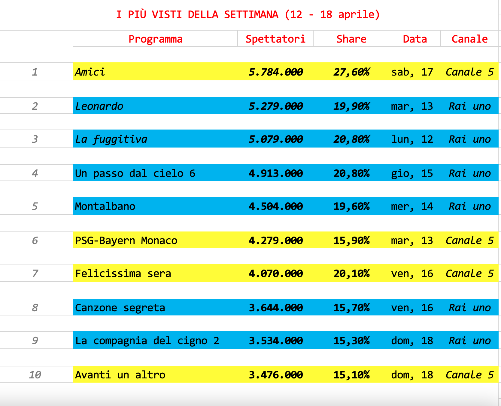 Al secondo posto l’ultima puntata di Leonardo, che, sebbene si mantenga ben oltre i cinque milioni di spettatori, ha subito un crollo vertiginoso di ascolti.