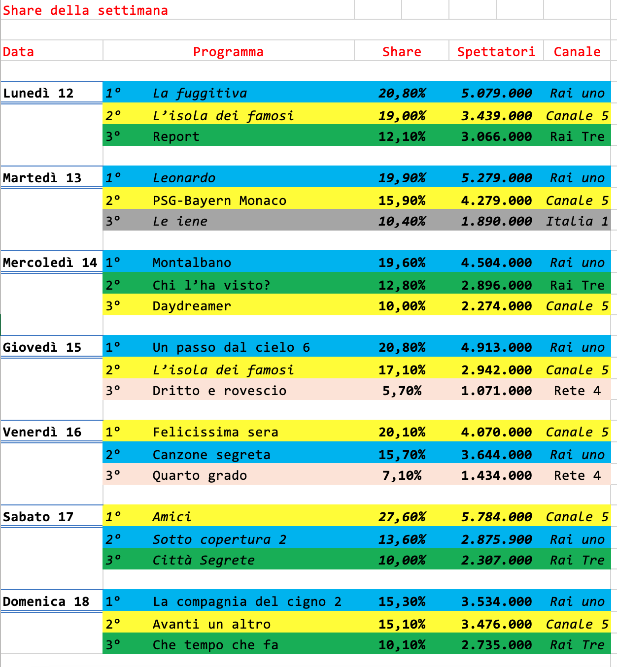 Settimana interessante da analizzare, una platea televisiva molto amplia e alcuni flop che lasciano pensare.