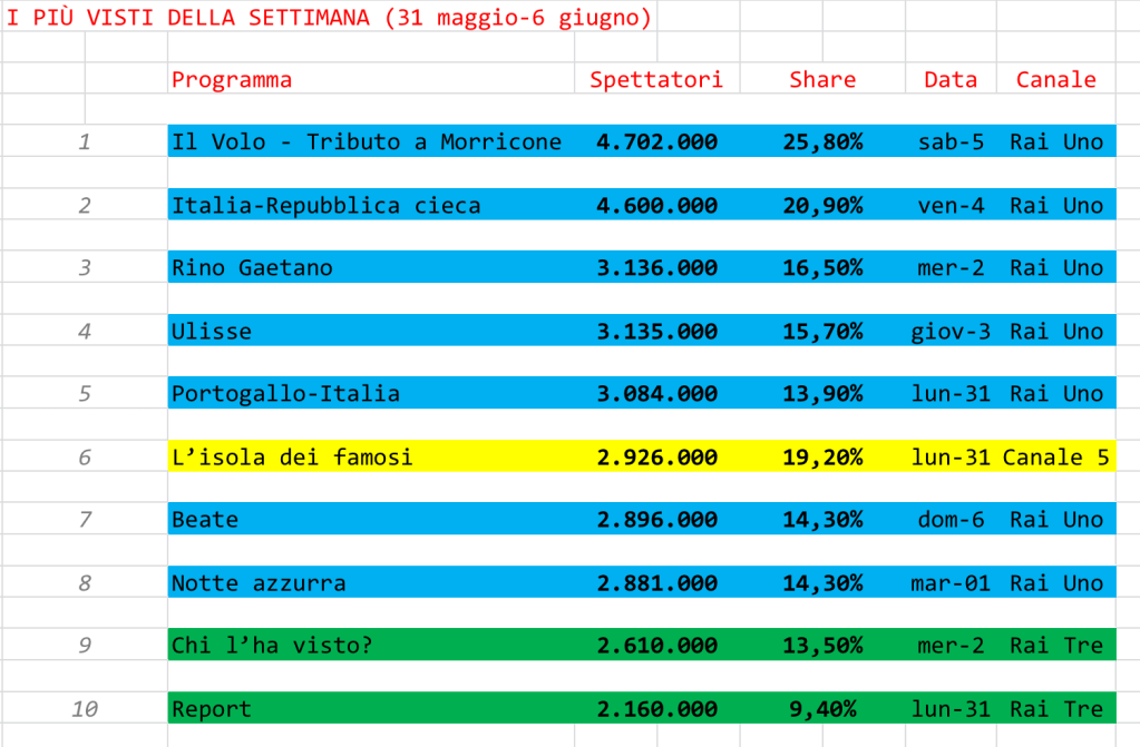 Per quanto riguarda questa prima settimana di giugno è quasi impressionante la Top Ten, un solo prodotto Mediaset si aggiudica la classifica e per giunta al sesto posto. L’isola dei famosi, infatti, non riesce comunque a sfondare i 3 milioni di spettatori.