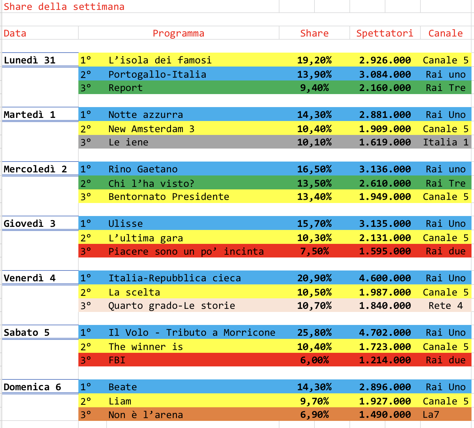 Il capitolo share, a grandi line, segue la classifica precedente. Mediaset risulta quasi del tutto assente, anche quando sulle reti rai vanno in onda delle repliche. Non c’è proprio storia.