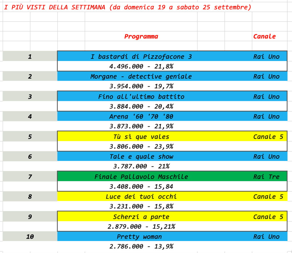 Bene, anche questa settimana, Tale e quale show che sbaraglia la concorrenza. Settimo posto per la finale di pallavolo maschile, disputatasi domenica 19, una serata che ha visto entrare in classifica anche Scherzi a parte, ma non la prima serata di Rai Uno con Da Grande.