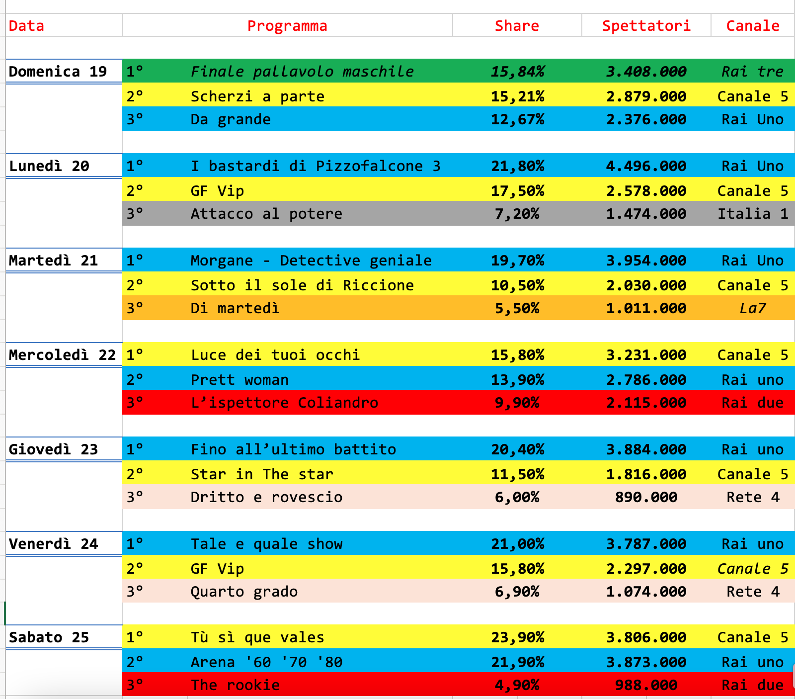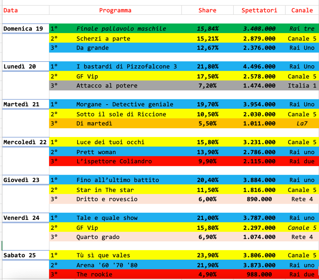Nel grafico che indica il podio per ogni giorno della settimana spicca domenica 19, giornata epocale per la pallavolo maschile e per rai tre che conquista il primo posto. Scivola in terza posizione Rai Uno con la prima delle due puntate di Da grande (il dato di domenica 26 verrà analizzato la prossima settimana).