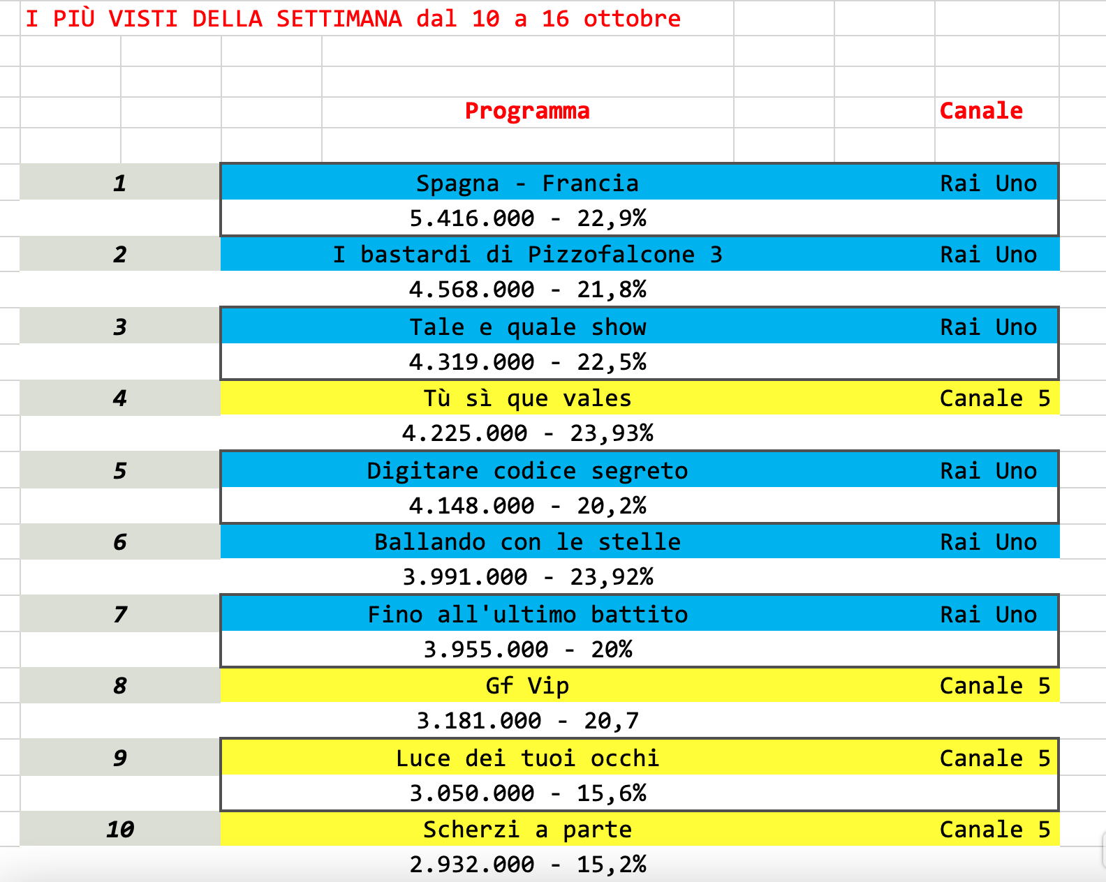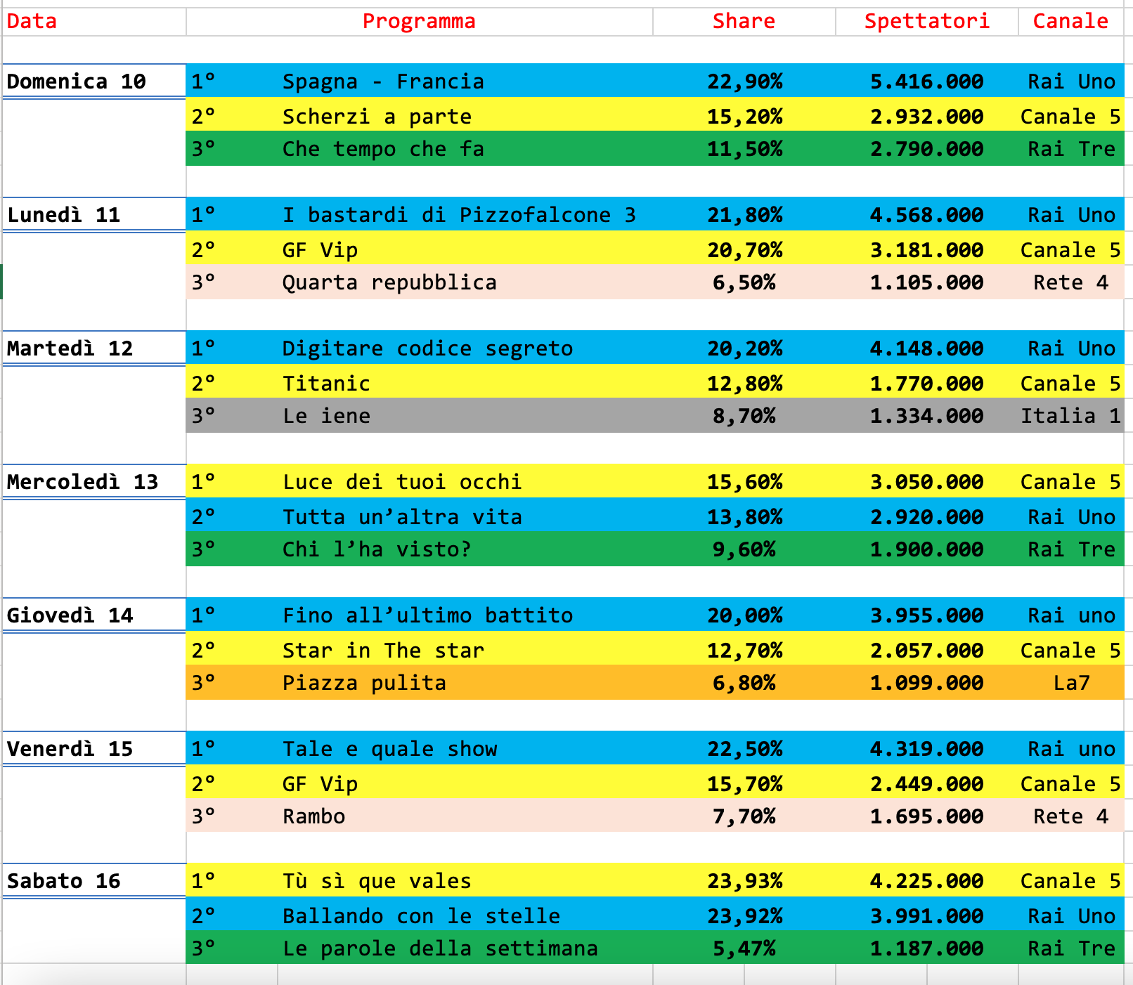 Gli ultimi tre posti sono occupati dal Grande Fratello Vip con la puntata del lunedì, Luce dei tuoi occhi che si mantiene bene per gli standard di canale 5 e Scherzi a parte.