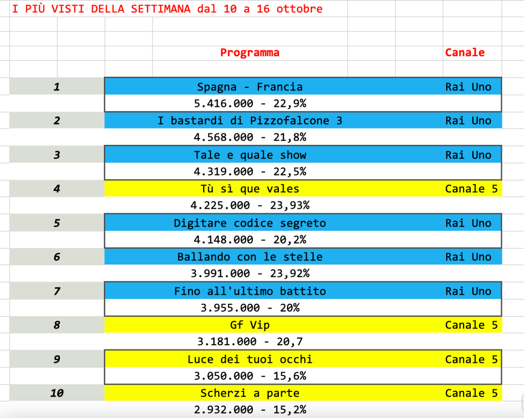 Analisi dettagliata degli ascolti relativi alla settimana dal 10 al 16 ottobre. Bene l’intrattenimento un po’ per tutti.