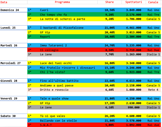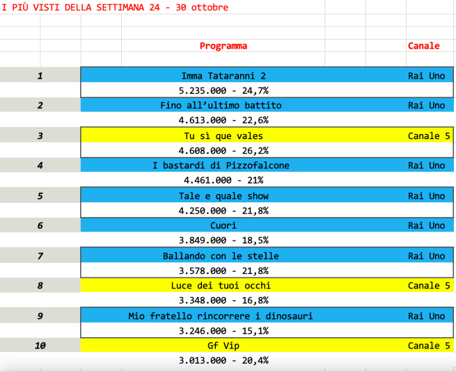 Ascolti Tv dal 24 al 30 ottobre. Rai Uno stravince, ma commette qualche errore di troppo nel daytime.