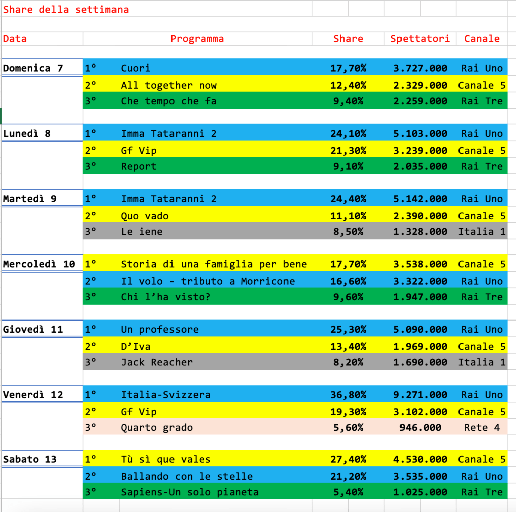 Per quanto riguarda la gara a colpi di share, il secondo grafico fa notare come canale 5 riesca a vincere solo due serate: una con la fiction Storia di una famiglia perbene e con Tù sì que vale.