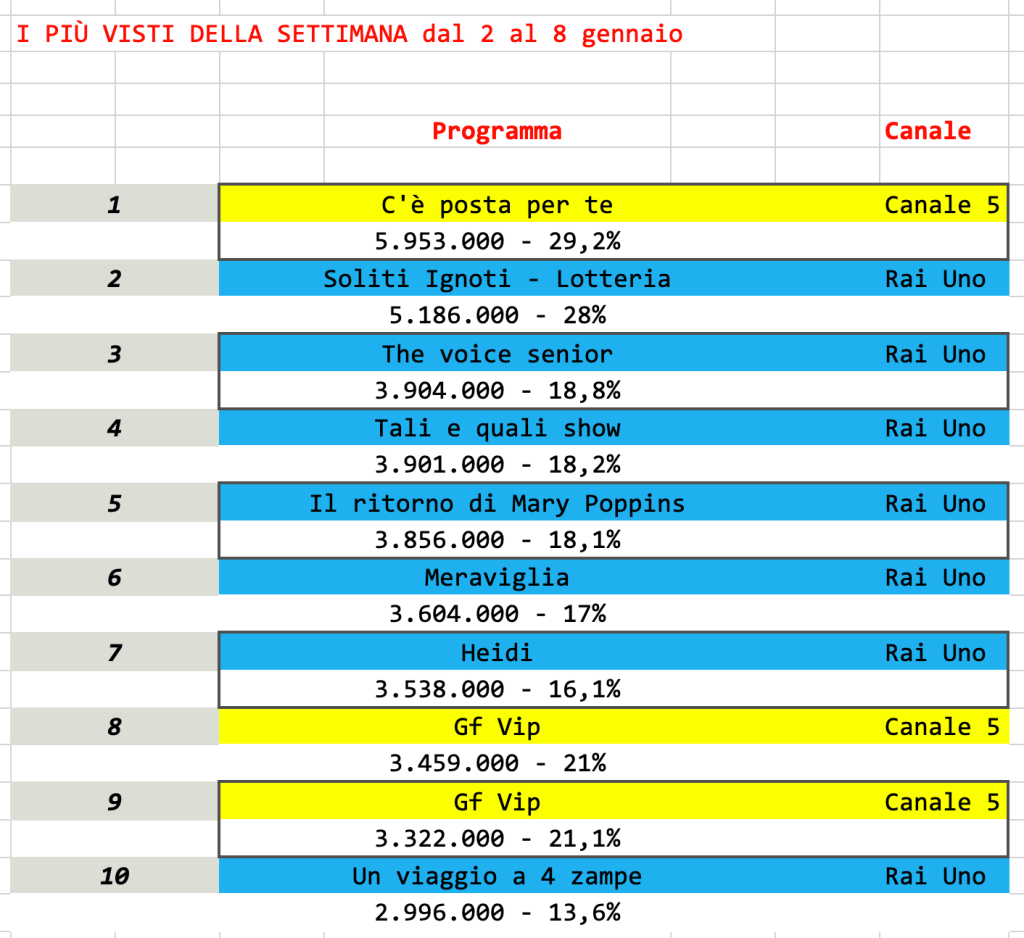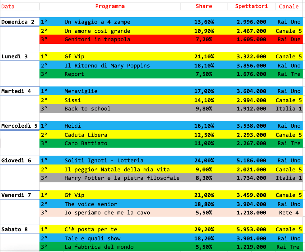 Analisi auditel 2-8 gennaio 2022. Prima settimana dell’anno all’insegna di Rai Uno. Tra novità e qualche replica.
