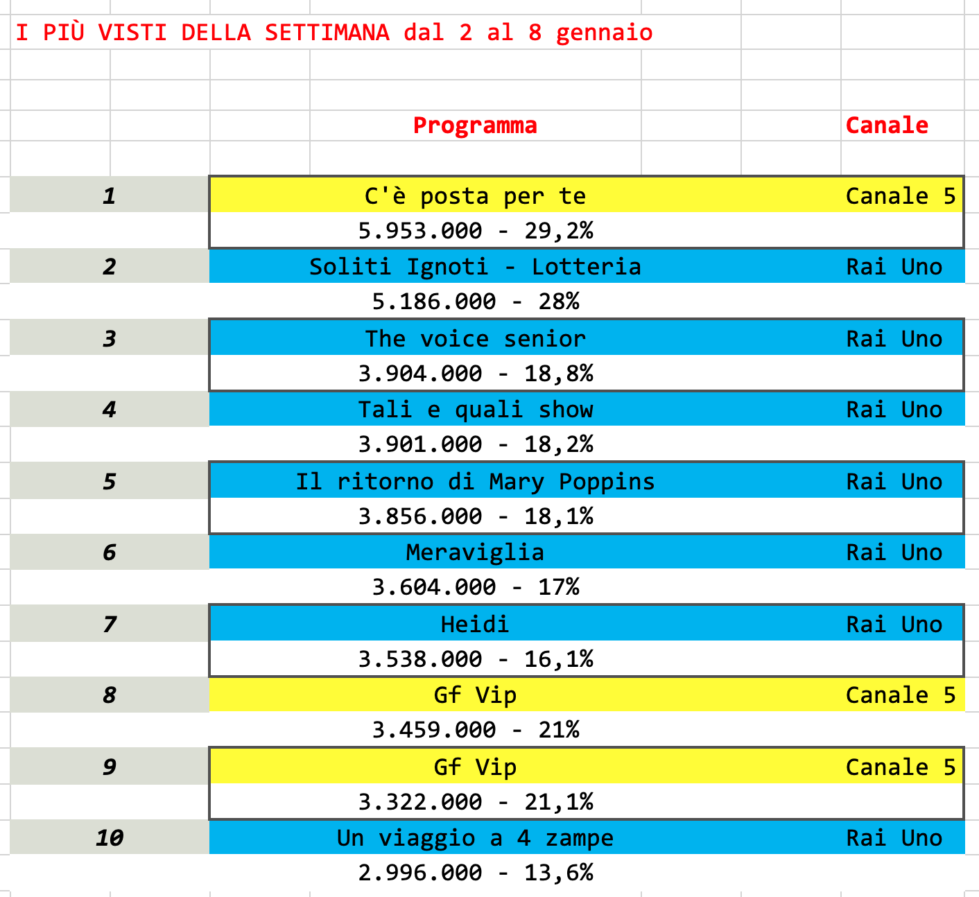 Al primo posto, però, c’è Maria De Filippi con la nuova stagione di C’è posta per te che sfonda quasi il muro dei 6 milioni. Il suo diretto competitor, la versione NIP di Tale e quale show, si posiziona comunque al quarto posto.
