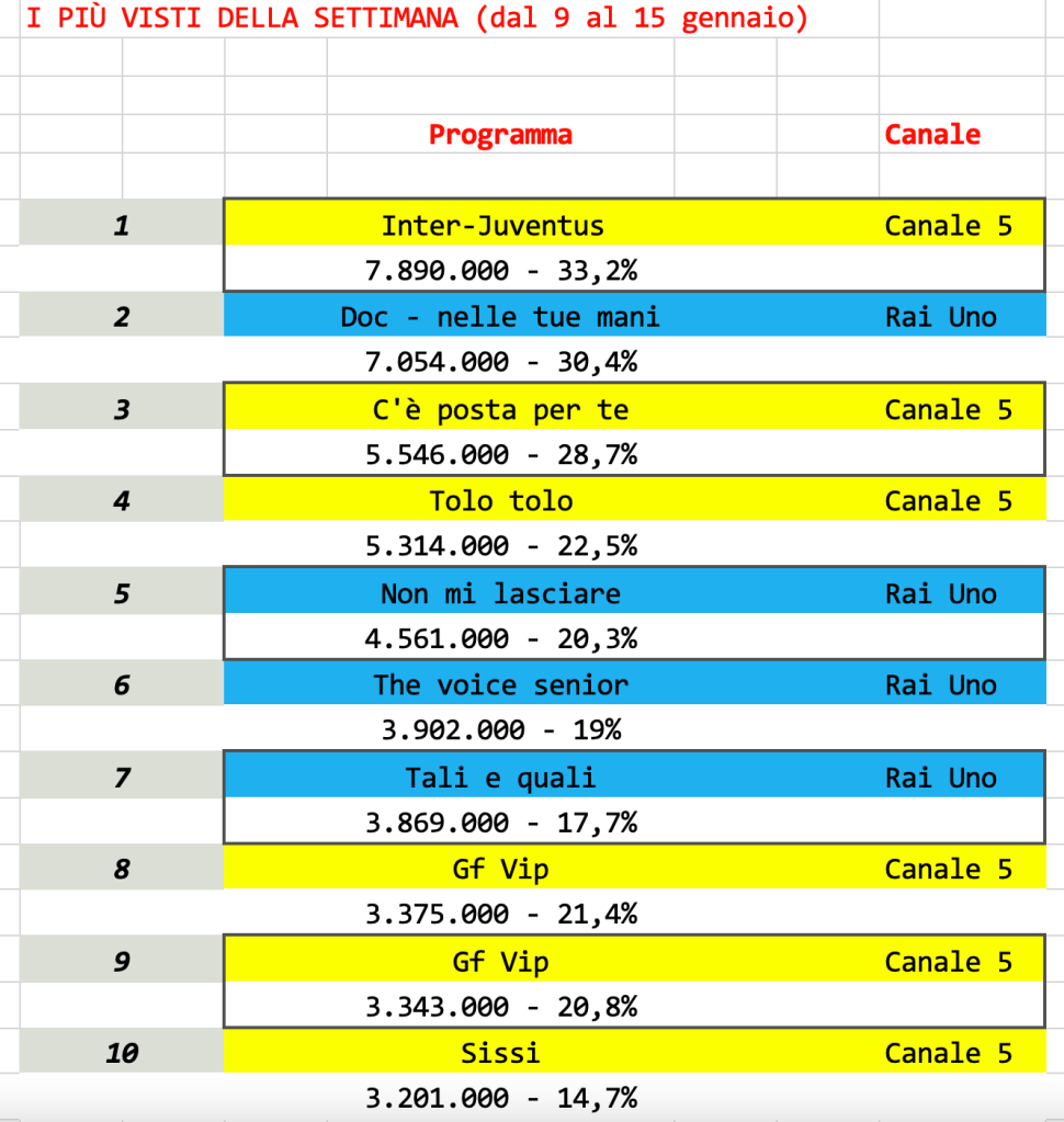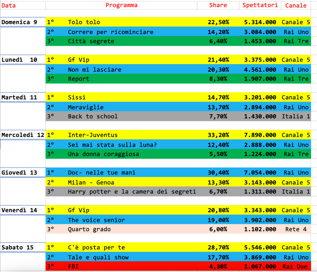 I due programmi di intrattenimento targati Rai si posizionano al sesto e settimo posto. E poi ancora le due serate del Grande Fratello Vip e la puntata finale di Sissi