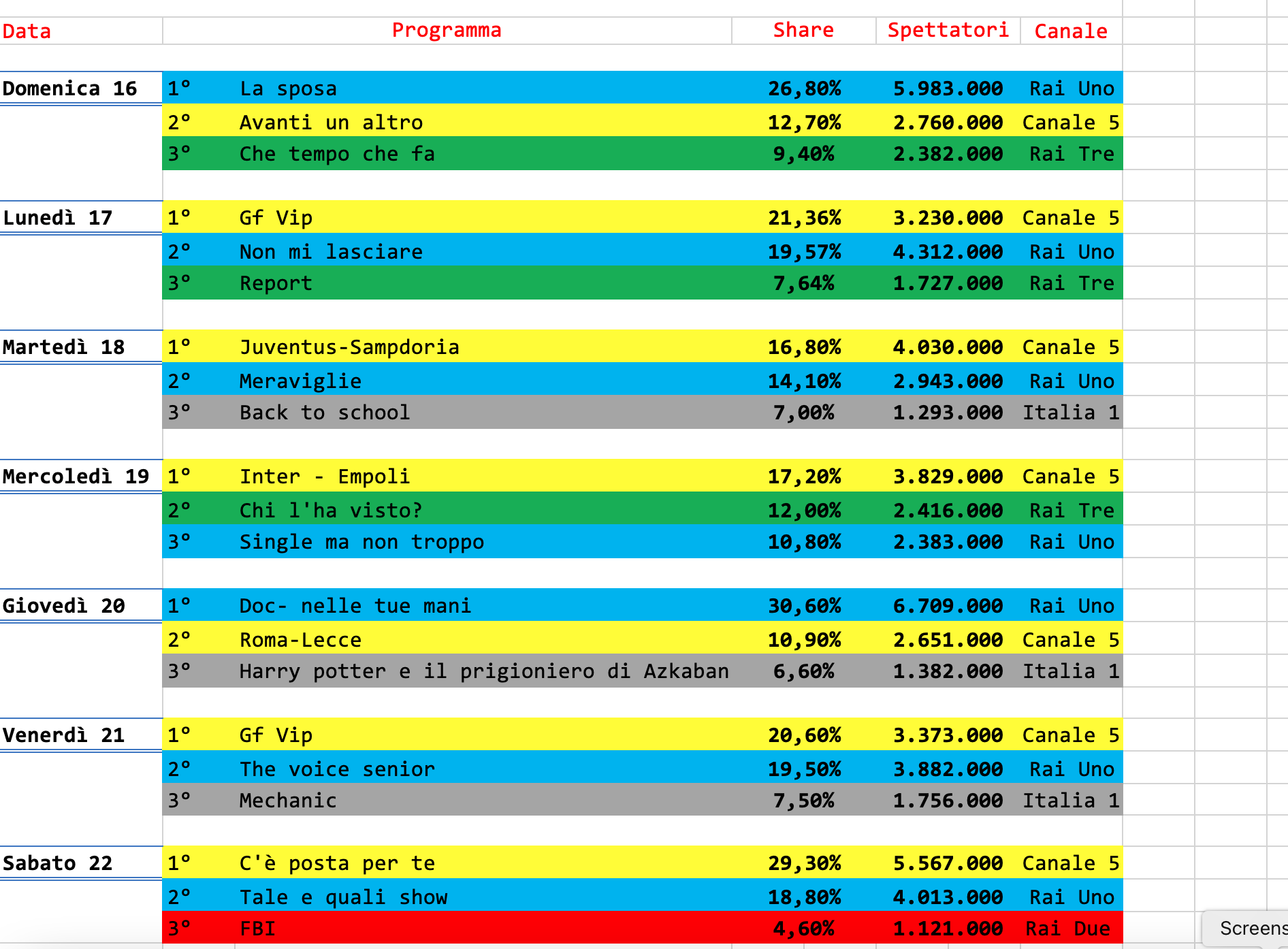 1. Tieni conto che per il Grande Fratello influisce moltissimo il fenomeno che in gergo si chiama “Ingrassare lo share” dettato dalla chiusura a tarda notte del programma. Quando avviene questo (generalmente in tutti i programmi di intrattenimento) il dato share risulta comunque sempre un po’ falsato.