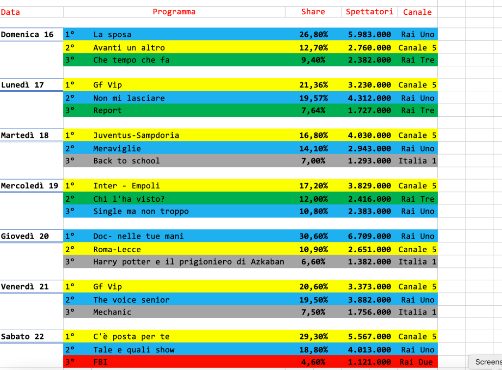 In classifica anche Inter-Napoli. E, come fanalini di coda, le due puntate del Grande Fratello Vip che superano i tre milioni di spettatori in entrambi i casi.