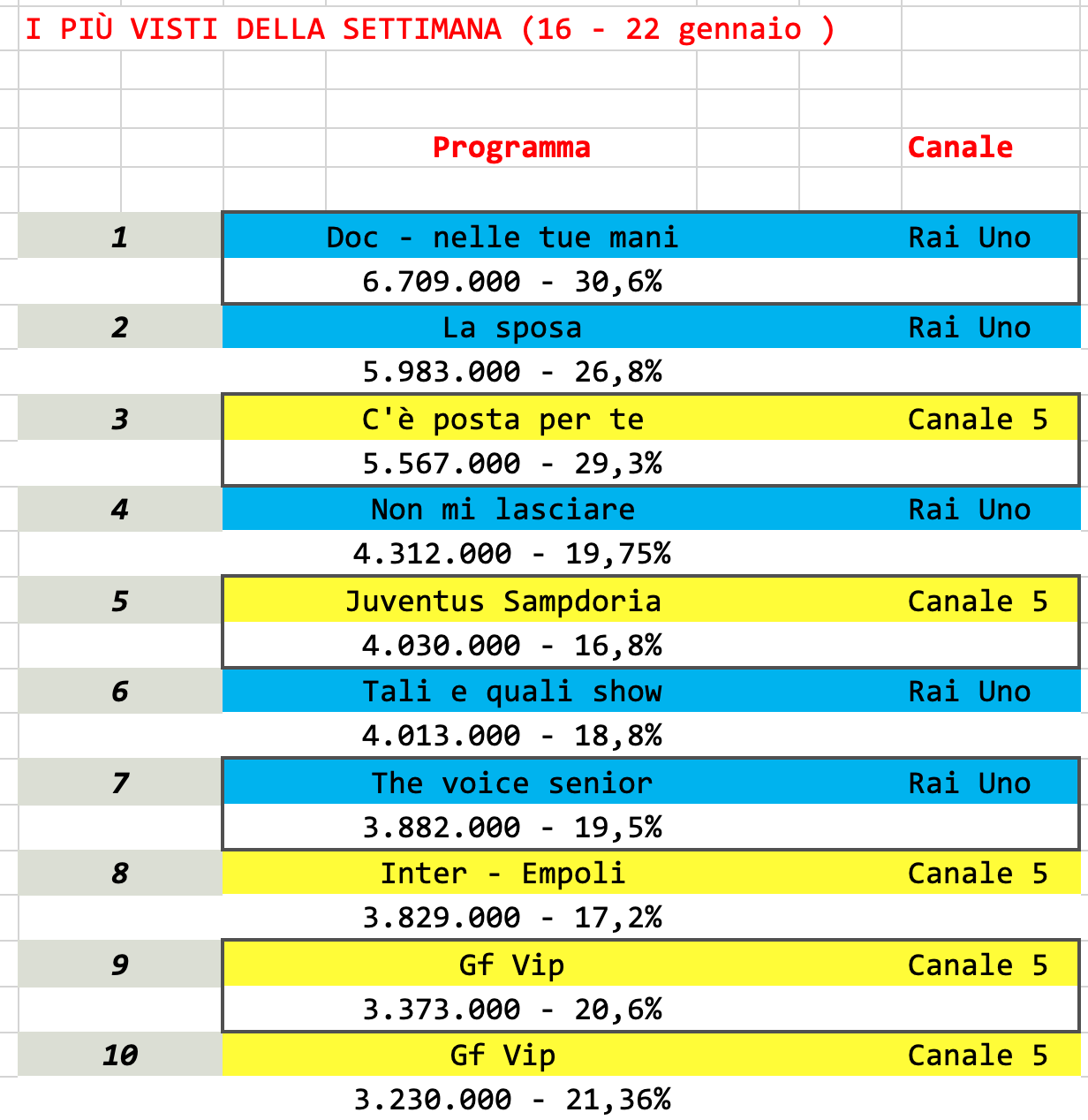 Sempre bene, C’è posta per te, che si posiziona al terzo posto e vince la serata del sabato. Il suo diretto competitor Tali e quali show, invece, si posiziona al sesto posto, salendo un po’ rispetto alla puntata della settimana scorsa. Quinta posizione per Juventus-Sampdoria. Chiude bene, The Voice senior, al settimo posto e una media di spettatori del tutto rispettabile.