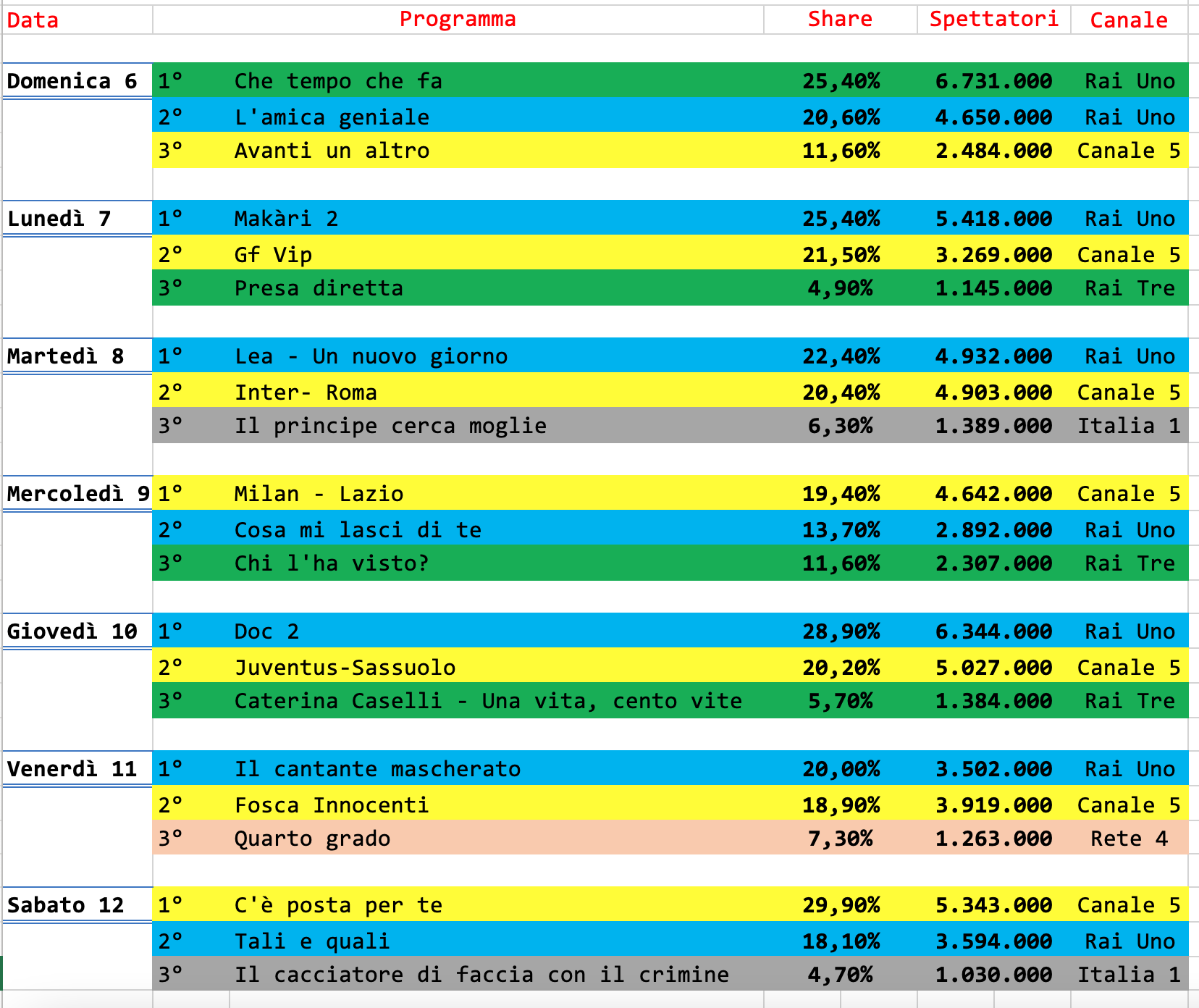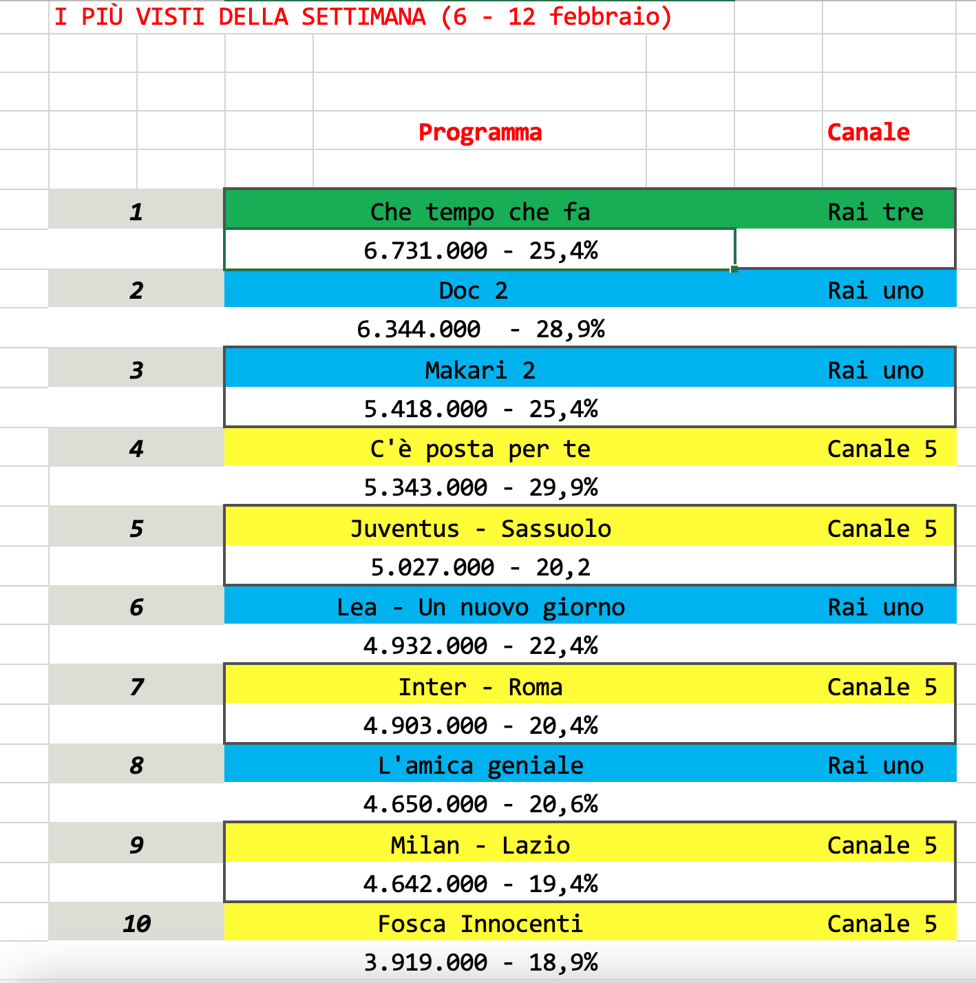 Analisi auditel dal 6 al 12 febbraio. Settimana con ascolti molto alti, complice il calcio, ma non solo.