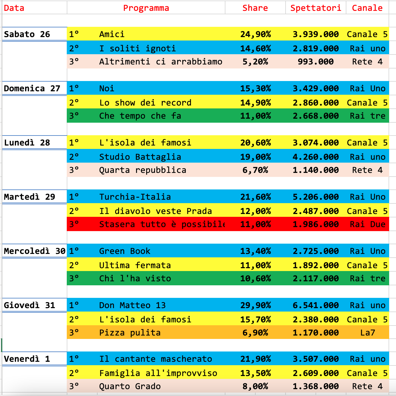 Bene Studio Battaglia con più di 4 milioni di spettatori e il 19% di share. Amici invece, sebbene al quarto posto, rimane al di sotto dei 4 milioni.