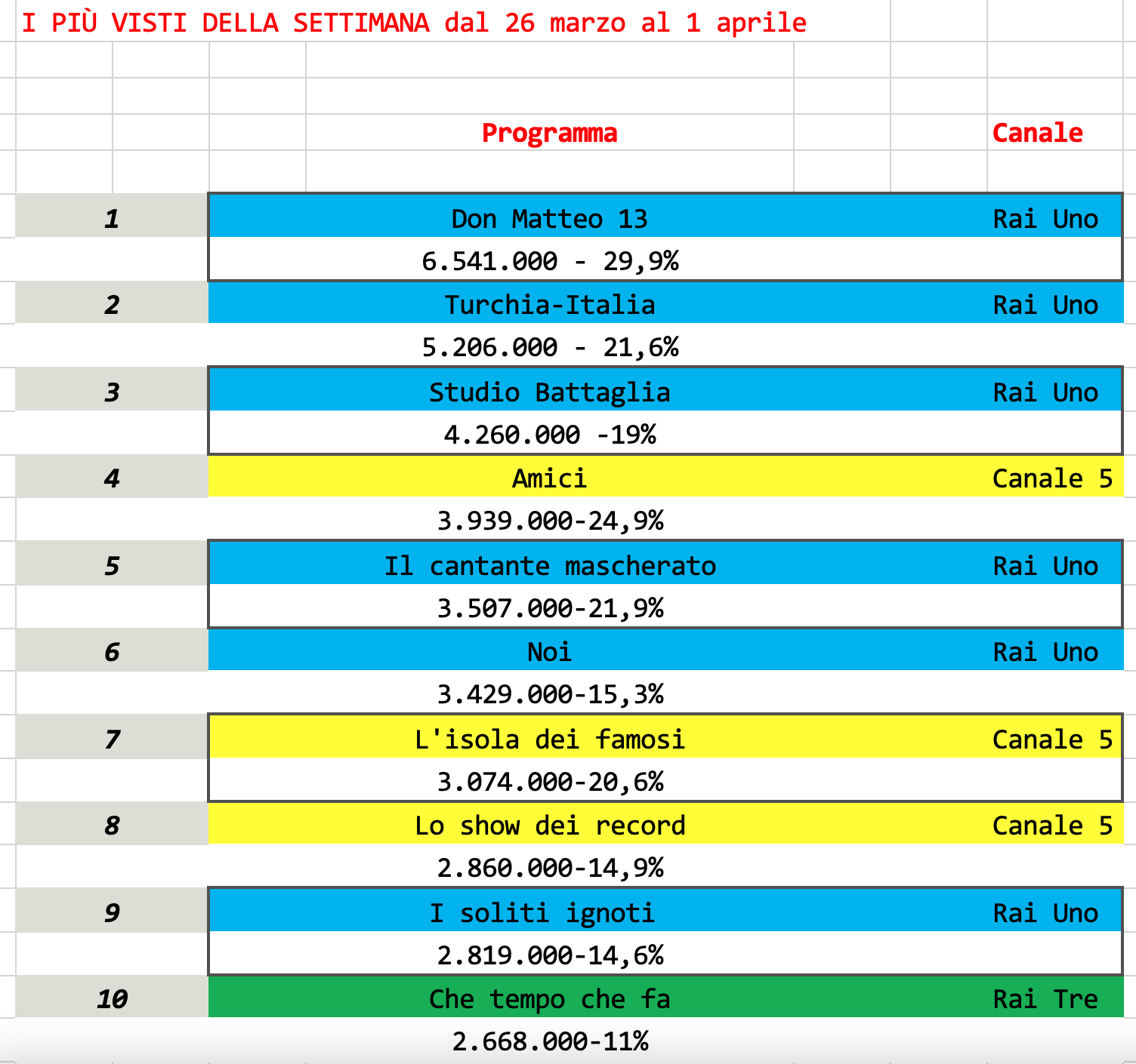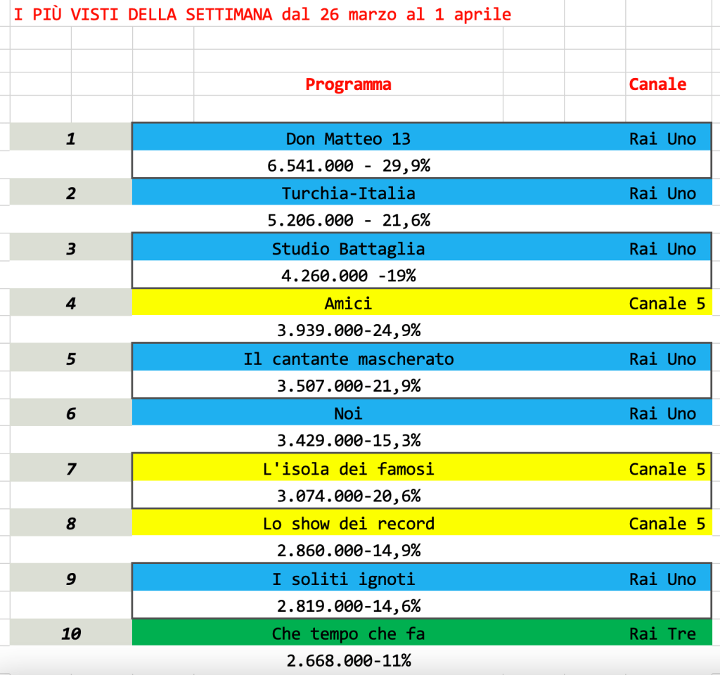 Analisi auditel dal 26 marzo al 1° aprile 2022. La Rai riprende le redini della Top Ten.