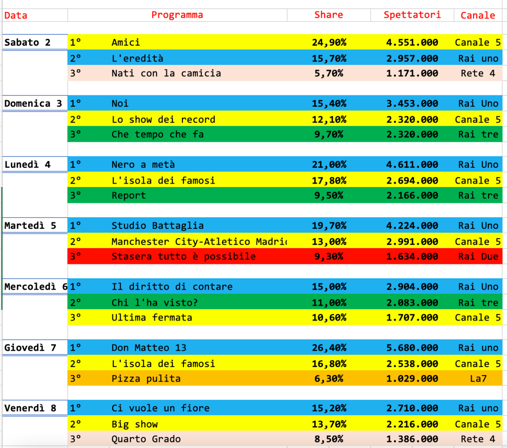 Il grafico dello share vede Rai Uno vincere quasi tutte le serate. Rimane fuori solo il prime time del sabato, ormai sempre terreno fertile di Maria De Filippi.
