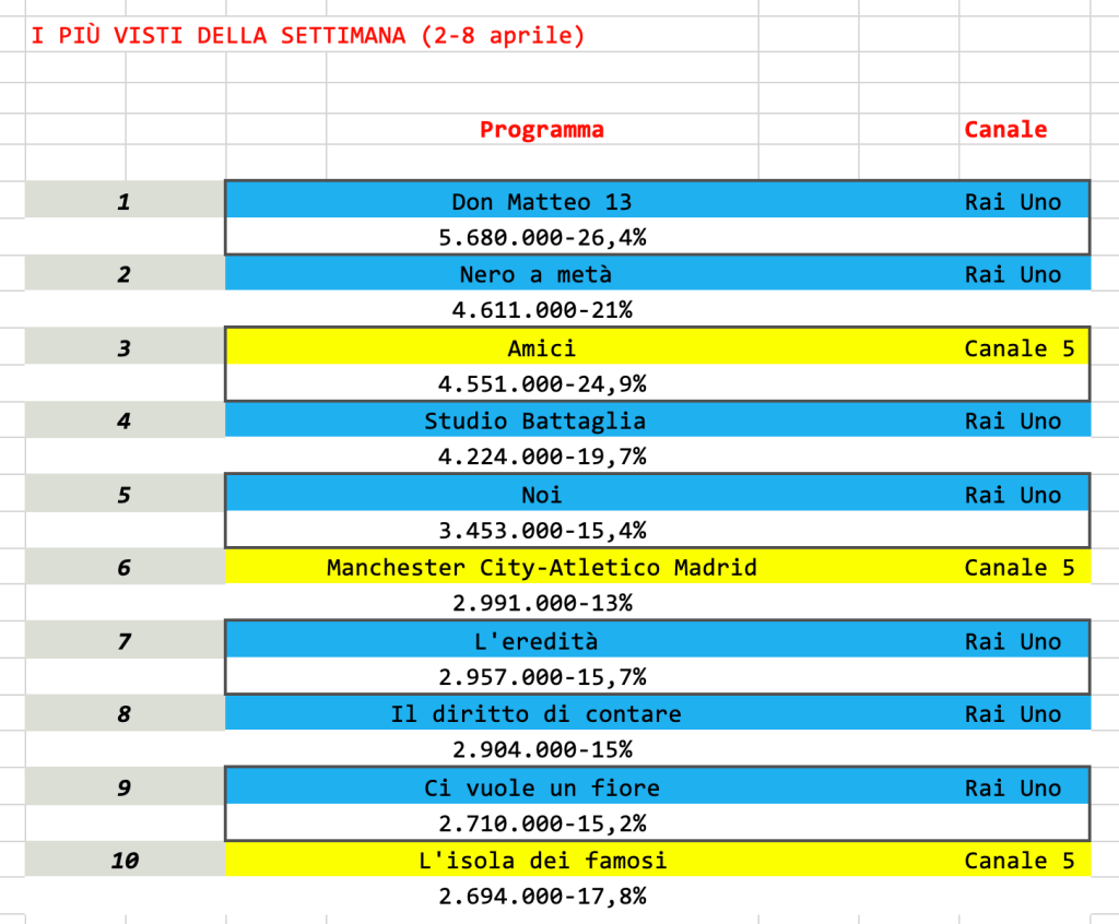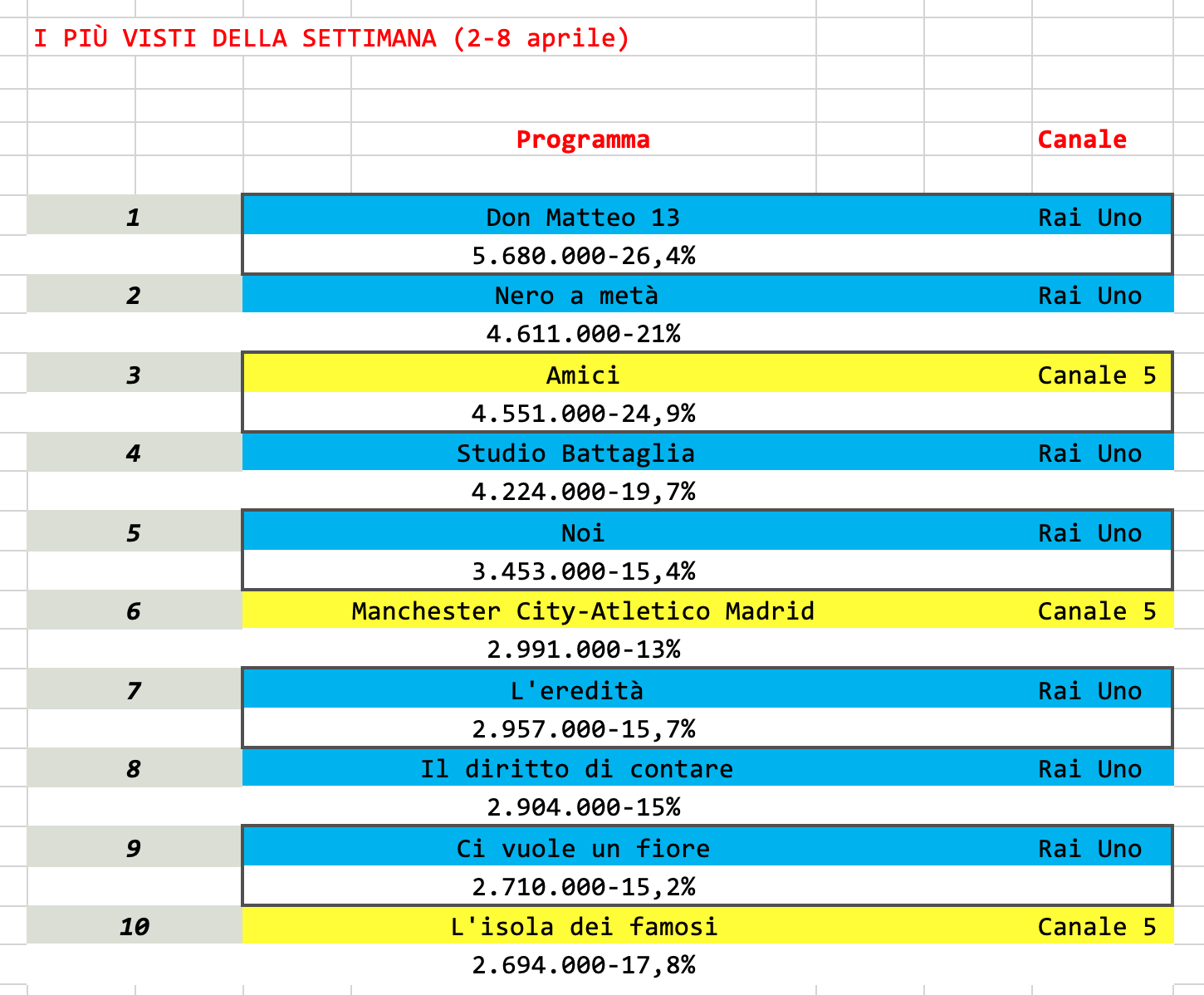 Analisi auditel dal 2 all’8 aprile. Amendola e Terence Hill campioni di ascolti.