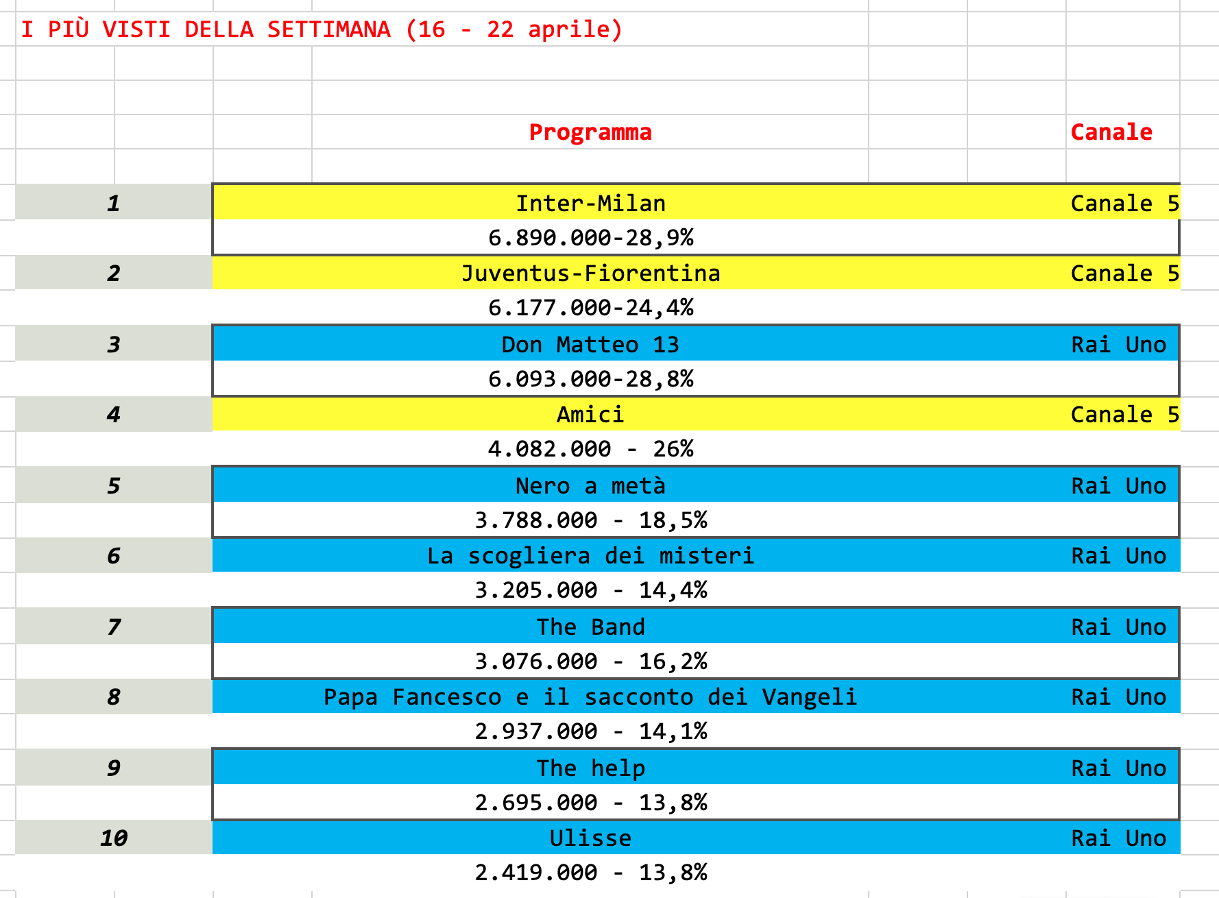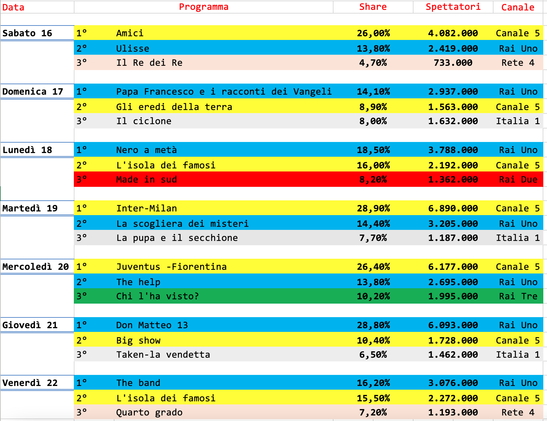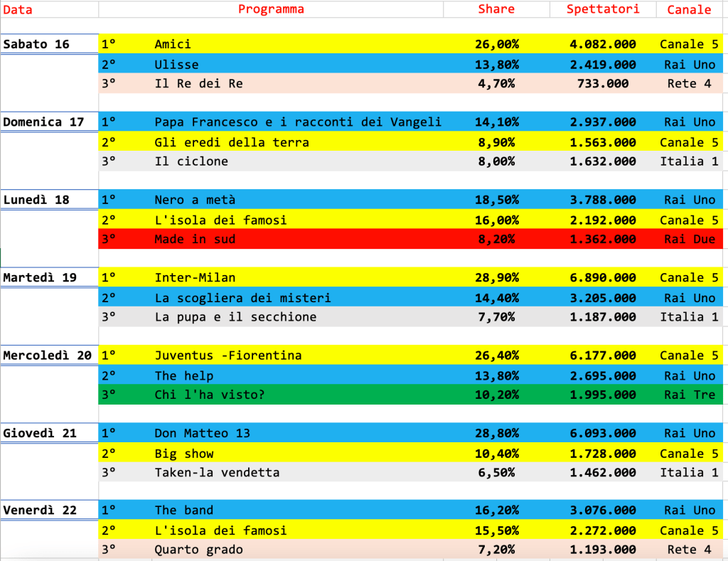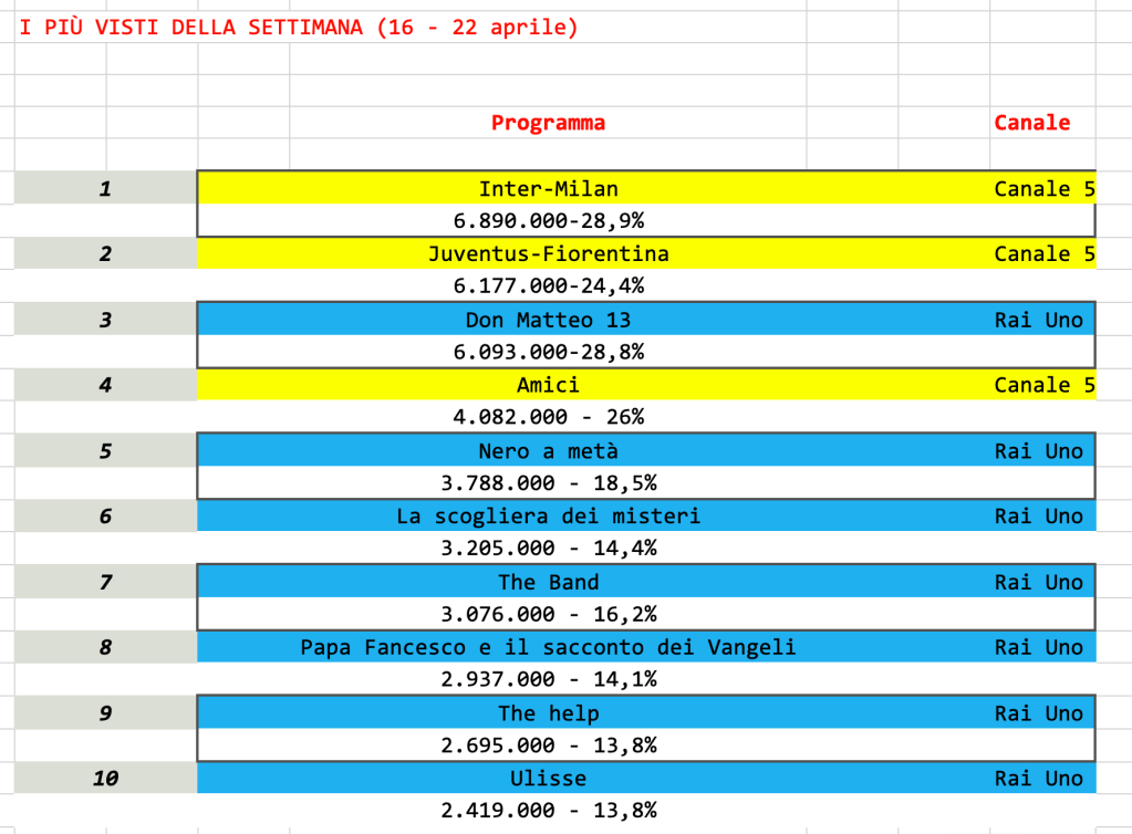Al primo e secondo posto due partite di calcio trasmesse da Mediaset. L’unico altro programma del biscione che entra in Top Ten è Amici, al quarto posto.