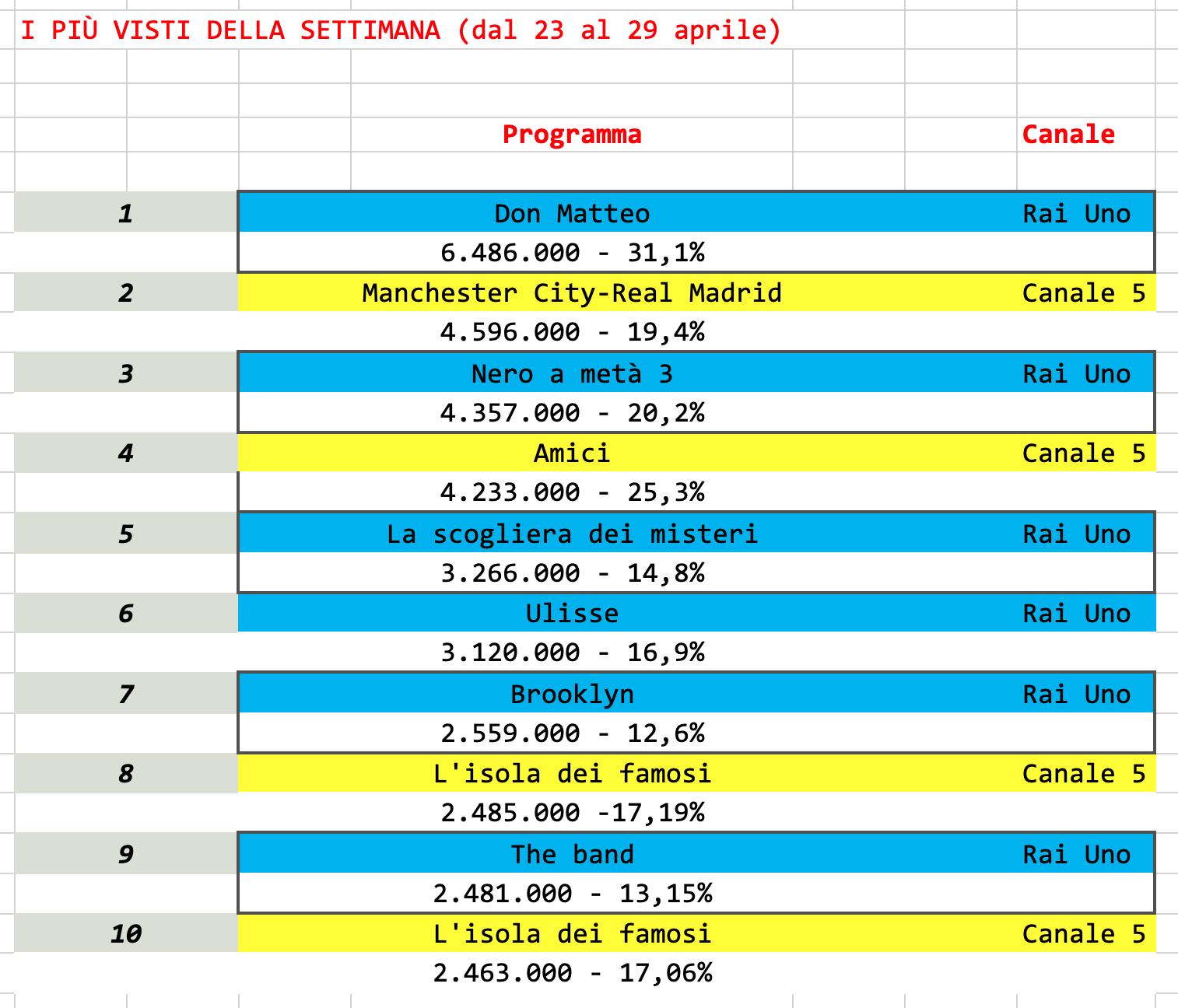 Secondo posto per il calcio in onda su canale 5. Mediaset si aggiudica anche il quarto posto con Amici, sempre sottotono rispetto agli altri programmi condotti da Maria de Filippi, l’ottava e la decima posizione con le due puntate de L’isola dei famosi. Anch’esse, va detto, in topten per via un generale bacino di spettatori più basso in tutta la settimana.