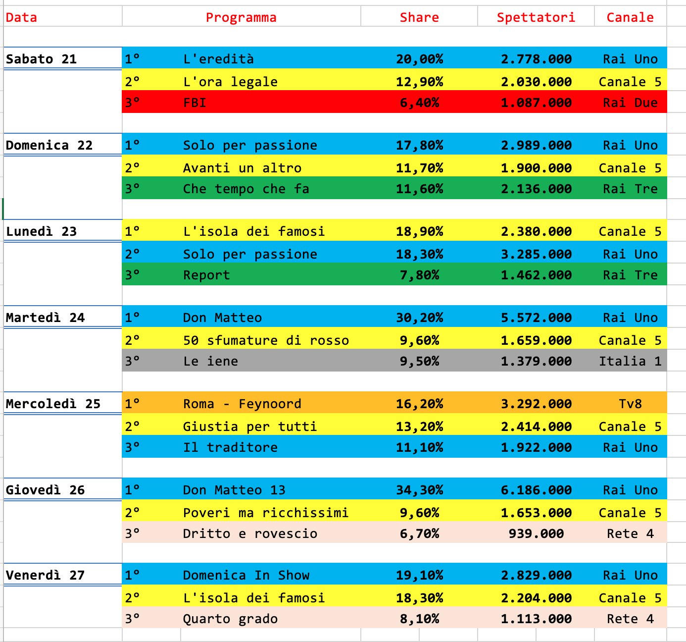 Il grafico dello share pende verso Rai Uno, con cinque serate vinte su sette. La serata del mercoledì va a Tv8, grazie al calcio.
