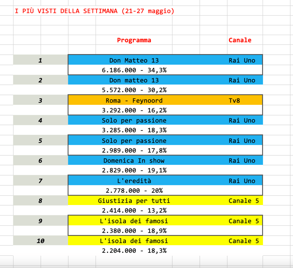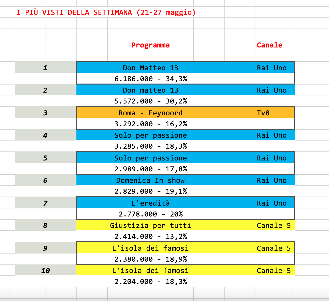 Il primo e il secondo posto della Top Ten sono, però, occupati dalle ultime due puntate di Don Matteo 13. Possiamo ufficialmente dire, operazione riuscita. Il cambio al vertice tra Terence Hill e Raul Bova non ha scontentato il pubblico, anzi. Di conseguenza è assolutamente confermata una quattordicesima stagione.