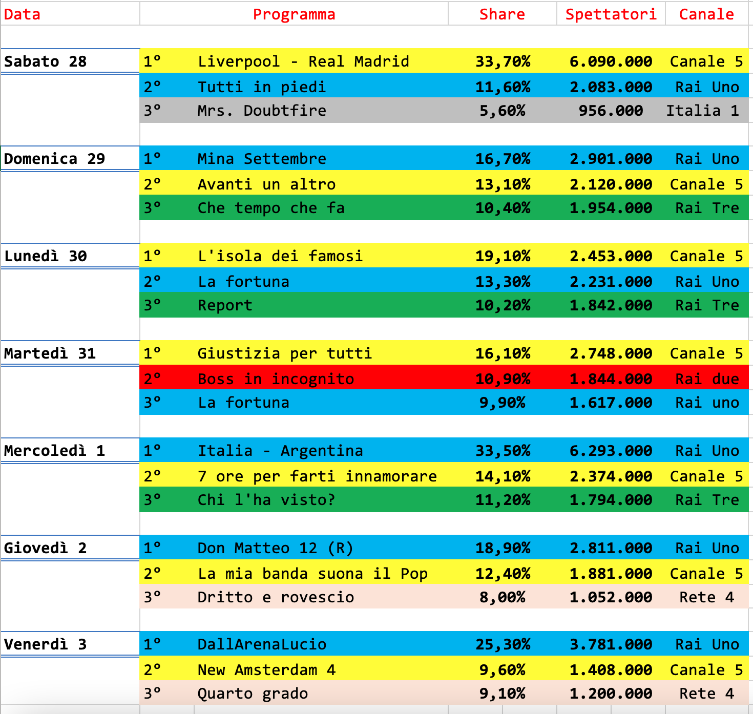 Benissimo la serata, condotta da Carlo Conti e Fiorella Mannoia, in ricordo di Lucio Dalla. Quarto e quinto posto, con però meno di 3 milioni di spettatori, per le repliche della prima stagione di Mina Settembre e Don Matteo 12.