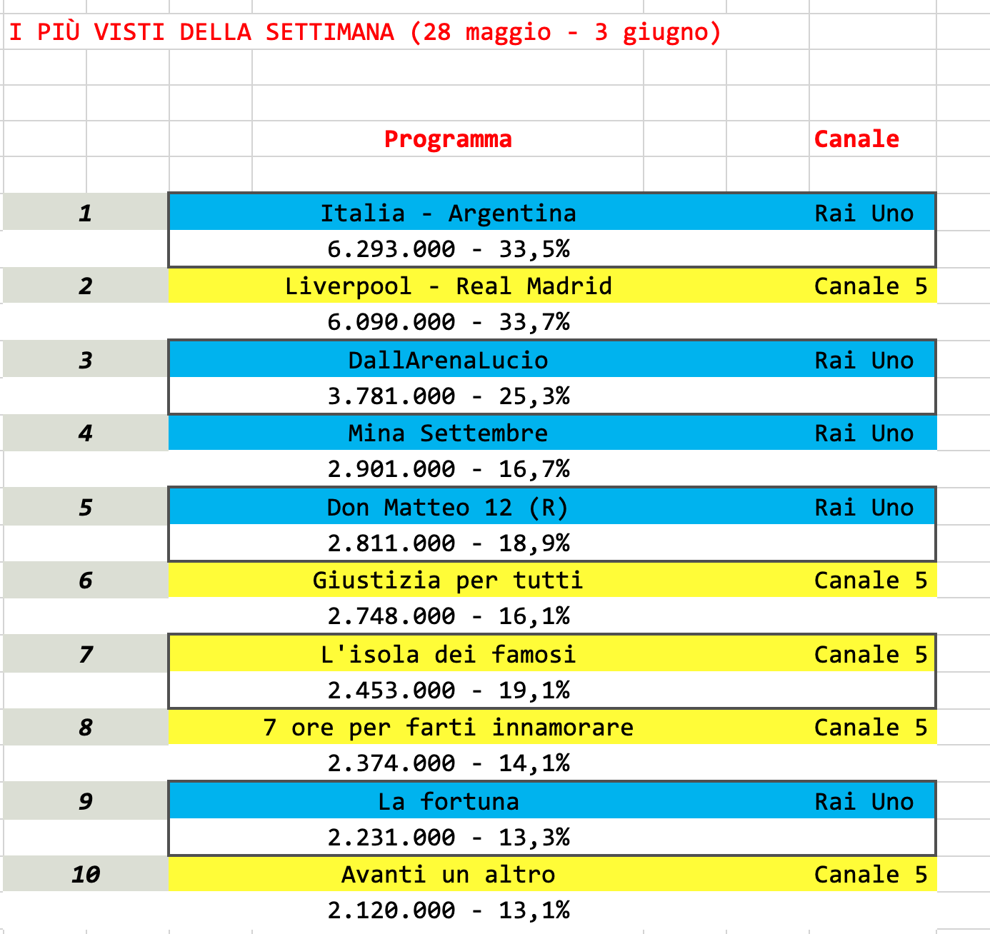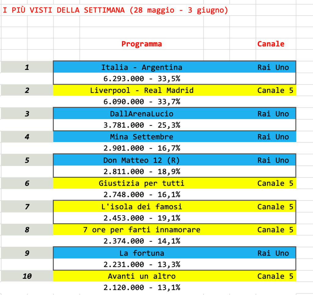 Questa, però, è stata anche la settimana di chiusura di tutti i programmi Rai del Day Time, pronti, in alcuni casi, a darsi il cambio con la loro versione estiva.