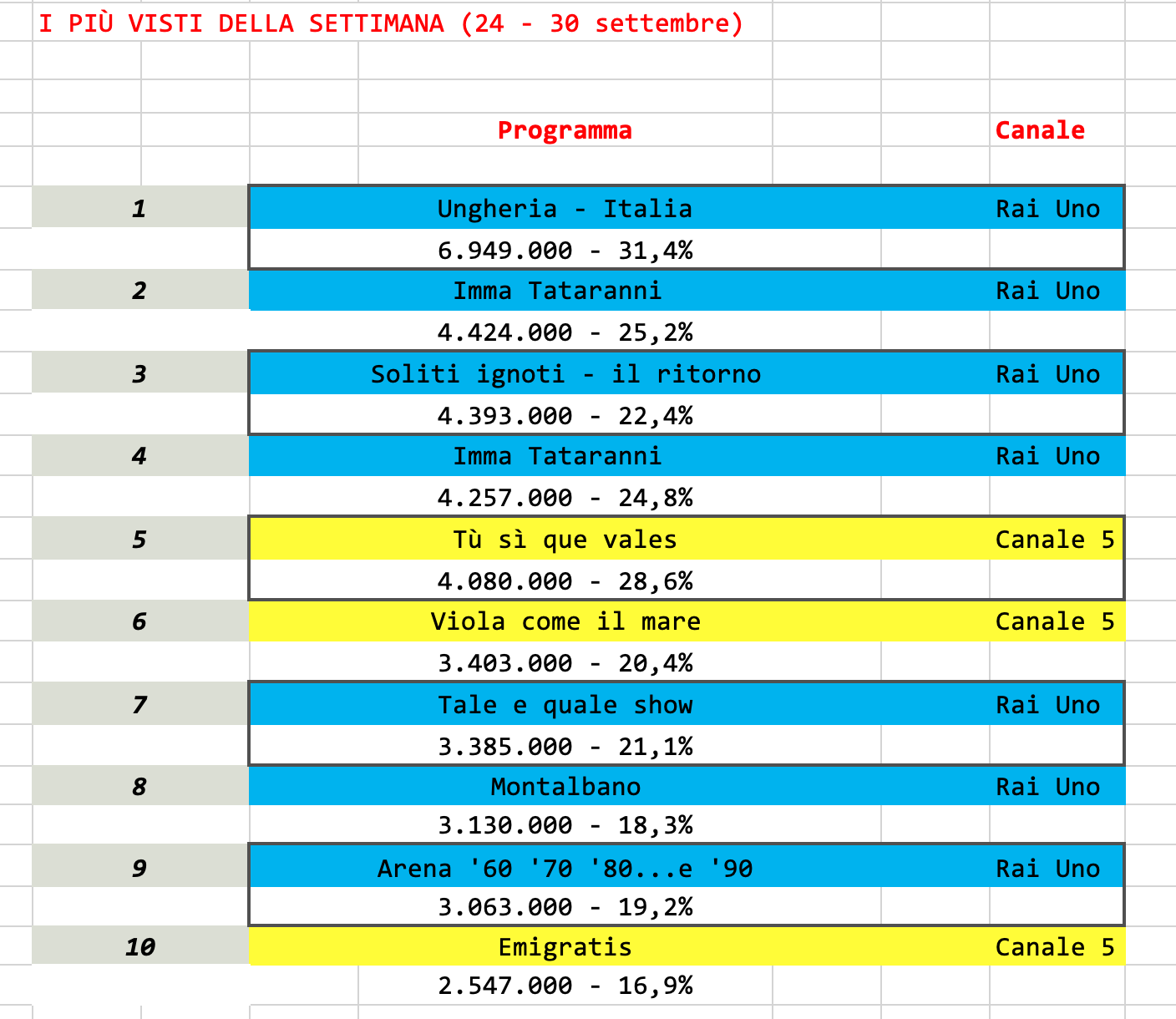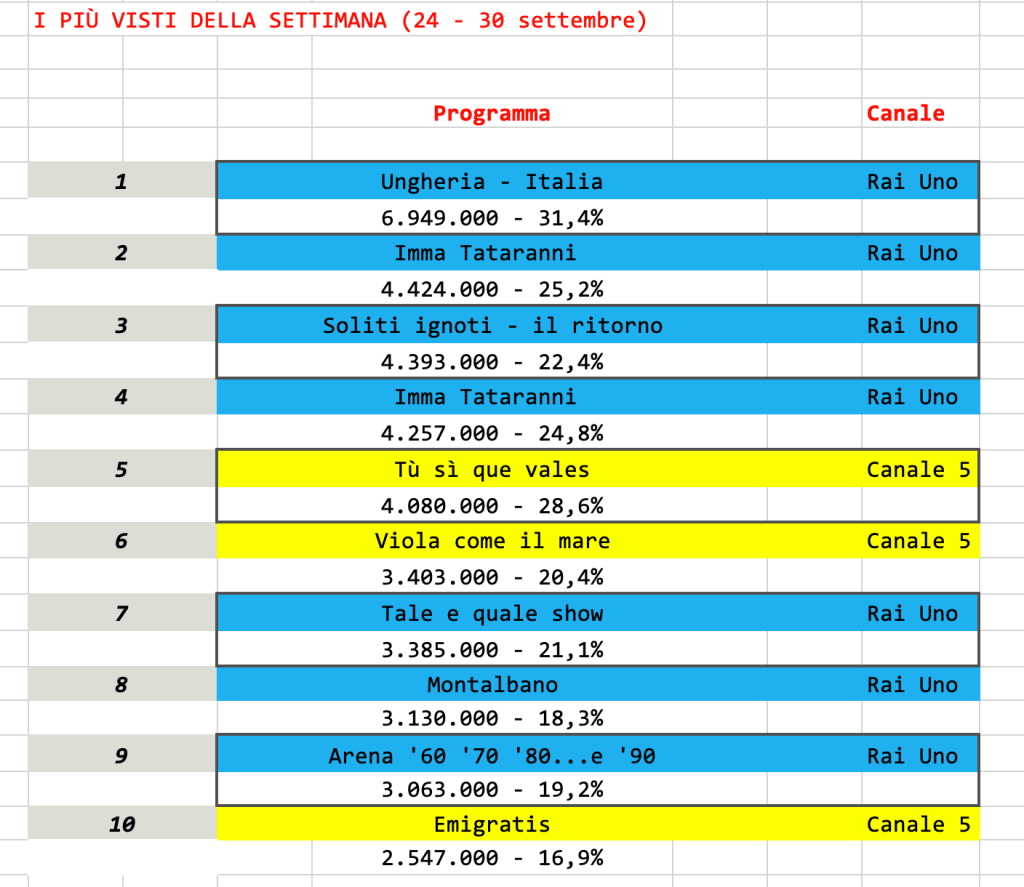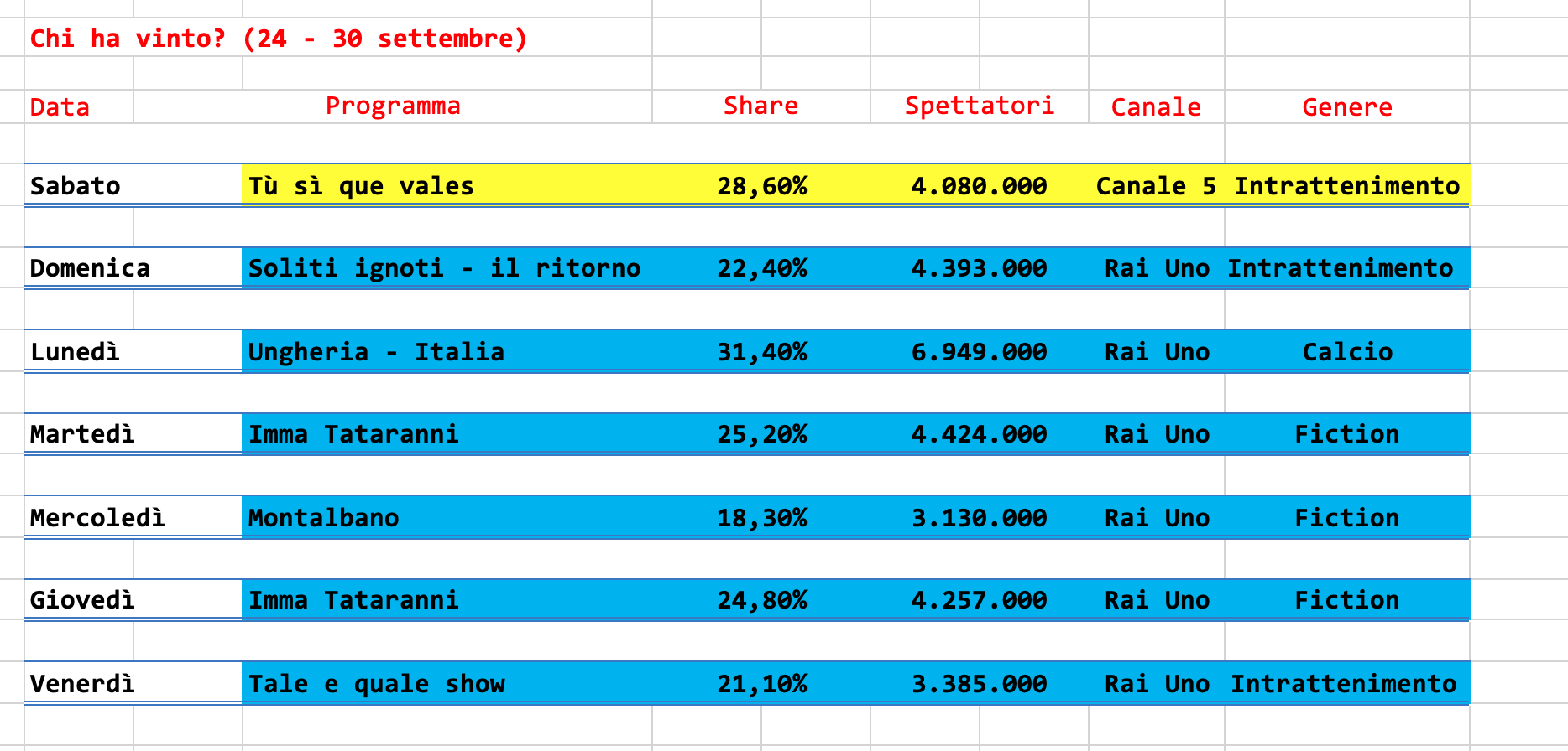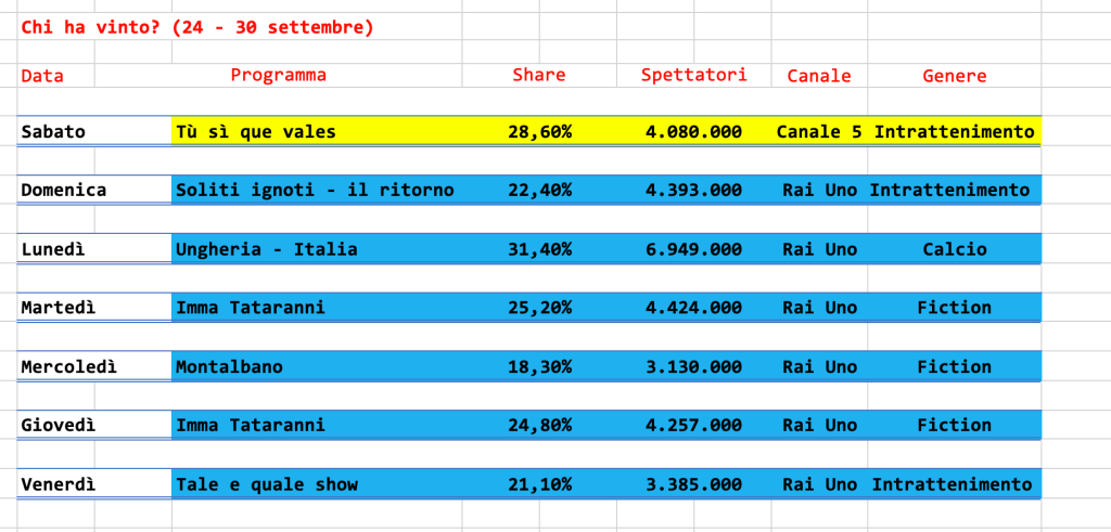 Come già si può intuire dalla TopTen, Rai Uno, questa settimana, stravince, cedendo il passo solo a Tù sì que vales.