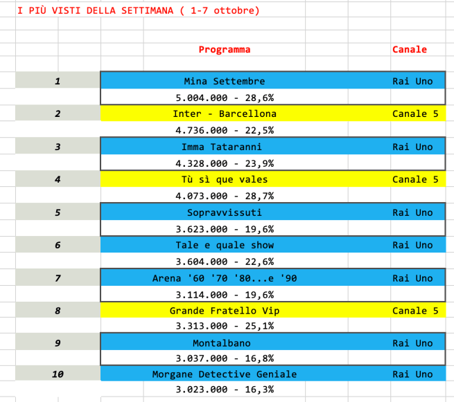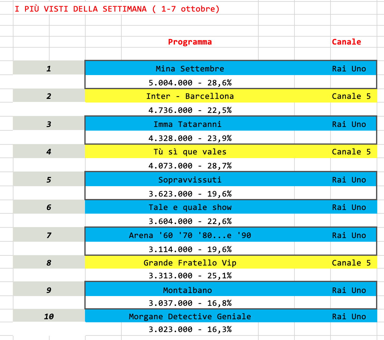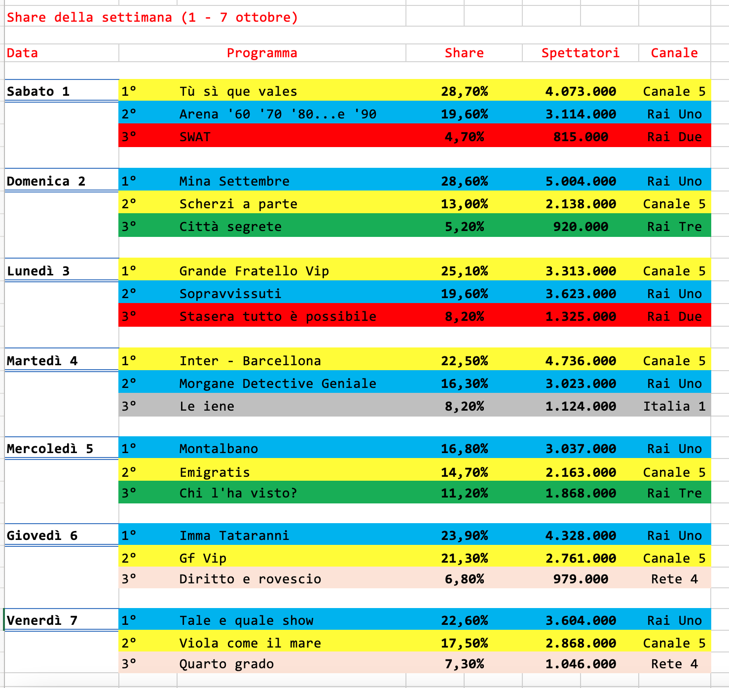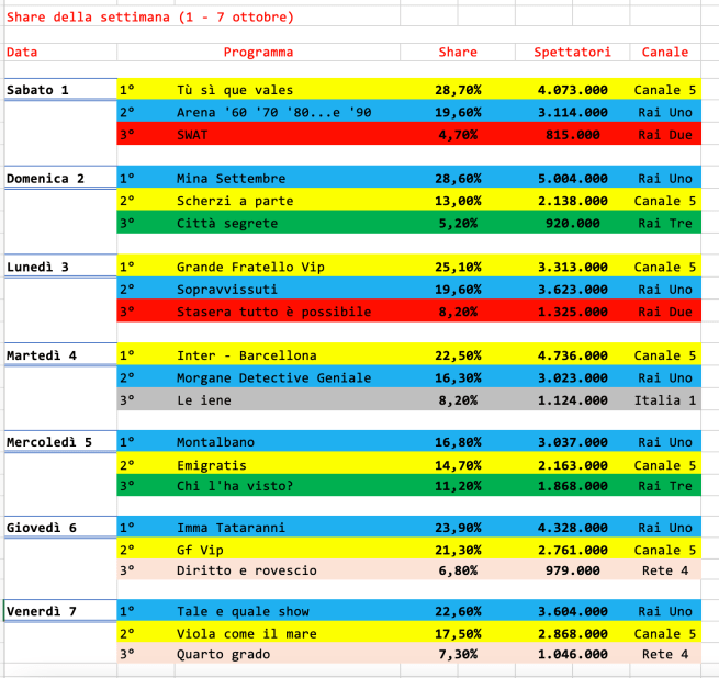 Analisi televisiva da 1 al 7 ottobre. Per colpa, o grazie, al Grande Fratello Vip è stata una settimana complessa per Mediaset, non solo per gli ascolti.
