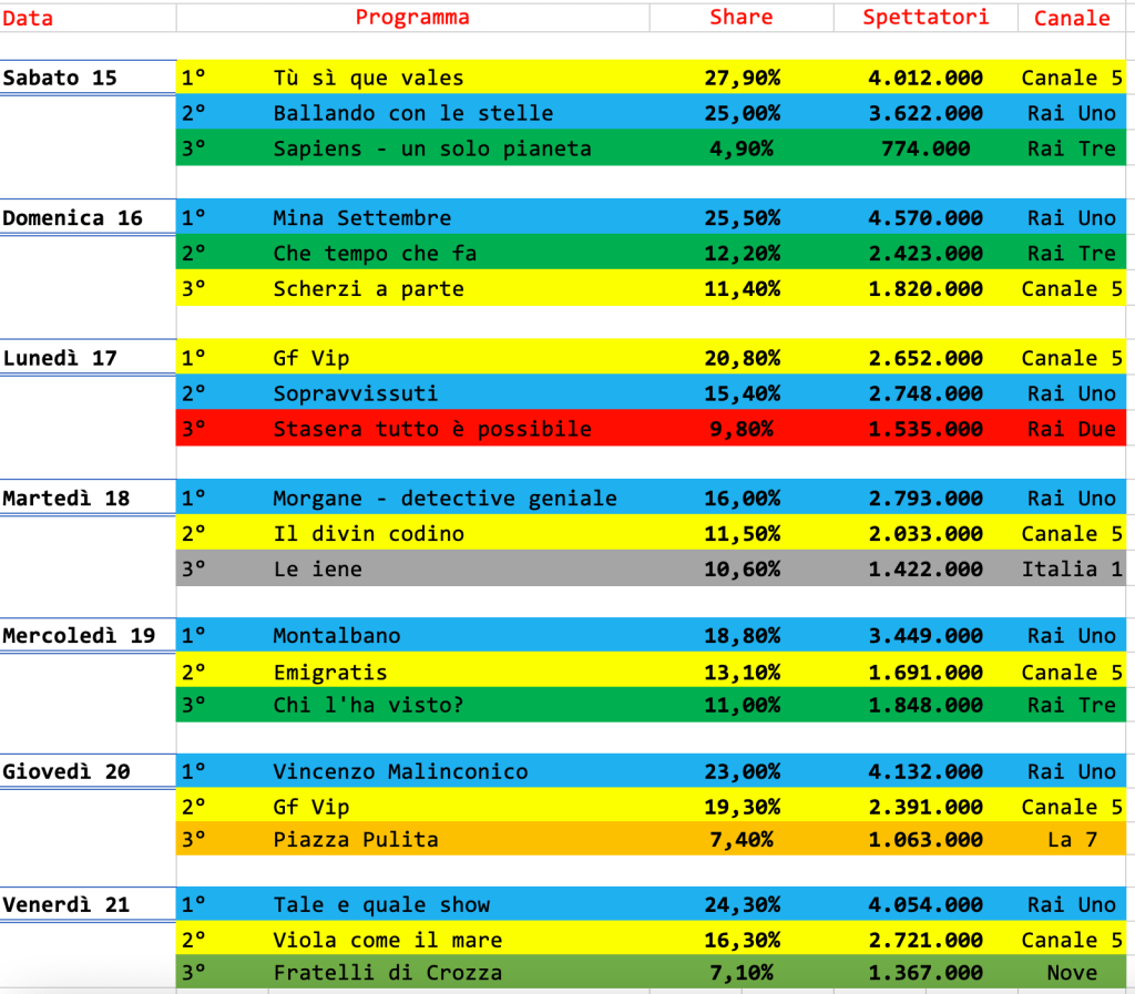 Cresce, senza volersi fermare, Tale e quale show che non solo si posiziona terzo, ma fa scivolare al nono Viola come il mare. La fiction con protagonisti Francesca Chillemi e Can Yaman non sembra avere fatto presa sul pubblico.