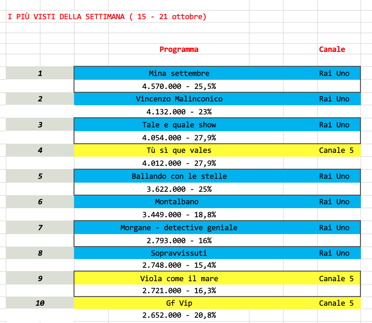 Ascolti 15 – 21 ottobre. Fiction Rai imbattibile (o quasi). Annaspa Canale 5.