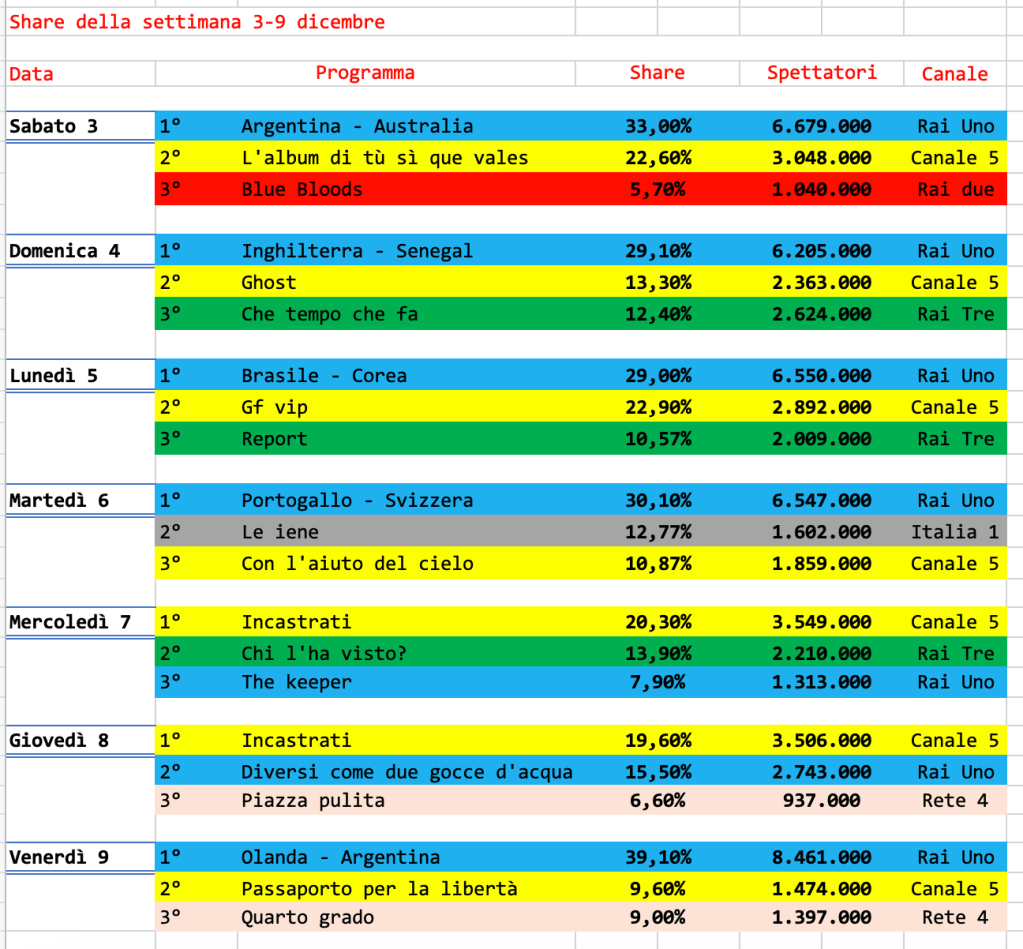 Ascolti dal 3 al 9 dicembre. I mondiali stanno, lentamente, volgendo al termine e in Tv si riaffaccia timidamente, ma con ottimi risultati, la regolare programmazione (almeno per quanto riguarda il prime time).