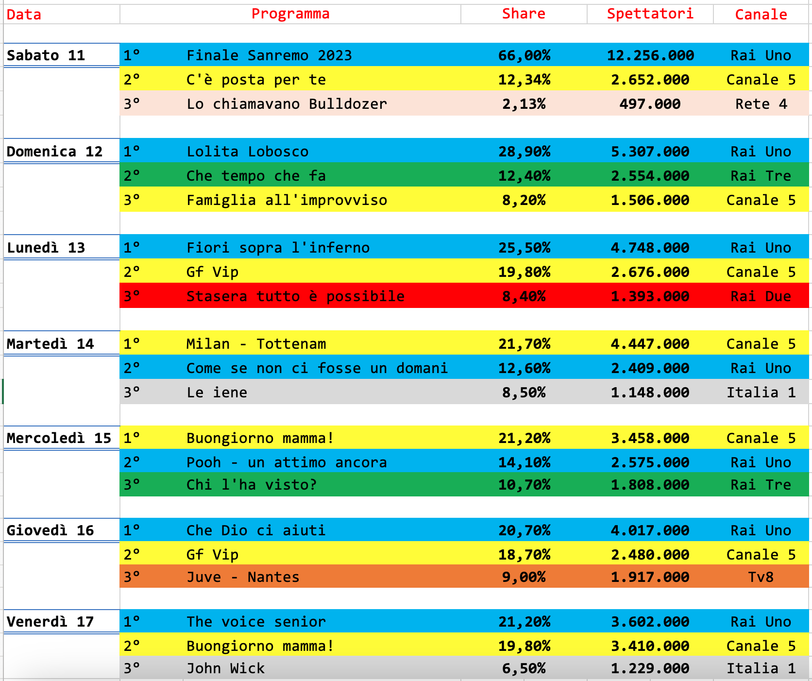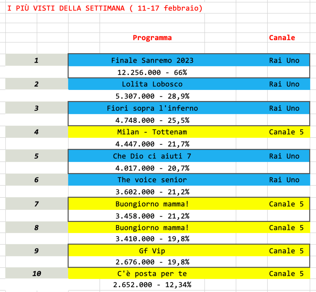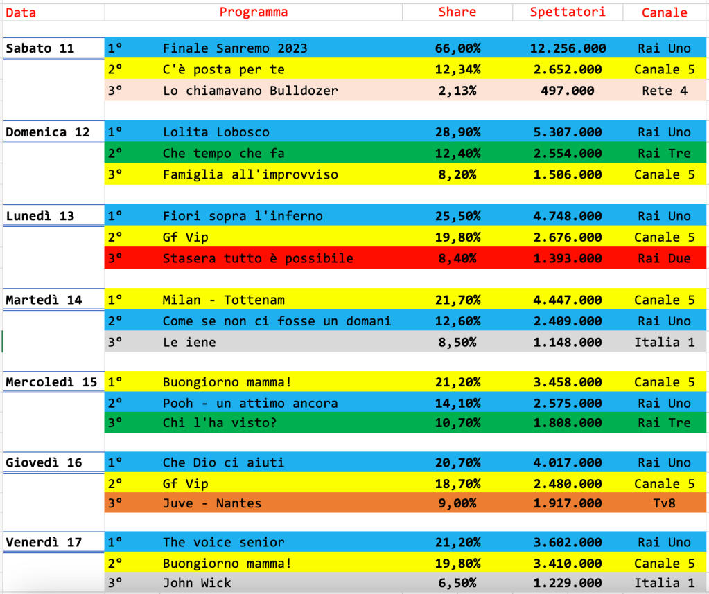 Classifica ancora viziata dall’ultima serata di Sanremo 2023, che senza ombra di dubbio si piazza al primo posto. Suona strano vedere C’è posta per te relegata al decimo posto. Mediaset quant’anno ha deciso di non lasciare campo libero al Festival, sbagliando palesemente.