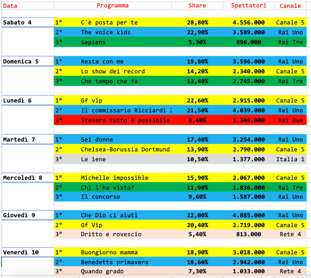 Il grafico dello share è pressoché invariato ormai da settimane. Da notare il secondo posto de Il commissario Ricciardi, che perde la gara dello share contro il Grande Fratello Vip, ma stravince in spettatori.