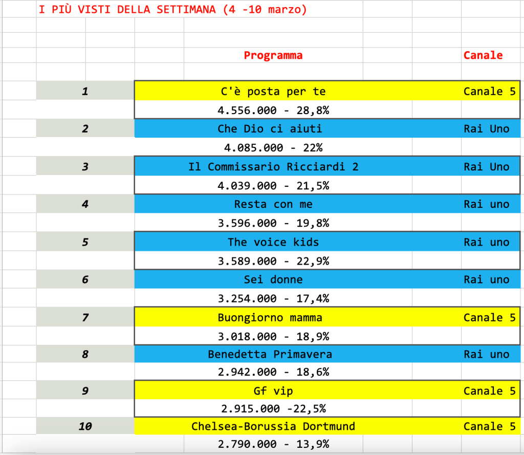 Analisi auditel 4 – 10 marzo. Maria De Filippi torna in onda, attraverso puntate già registrate, con C’è posta per te che arriva a più di 4,5 milioni di spettatori. Da sabato 18 marzo sarà la volta del serale di Amici.