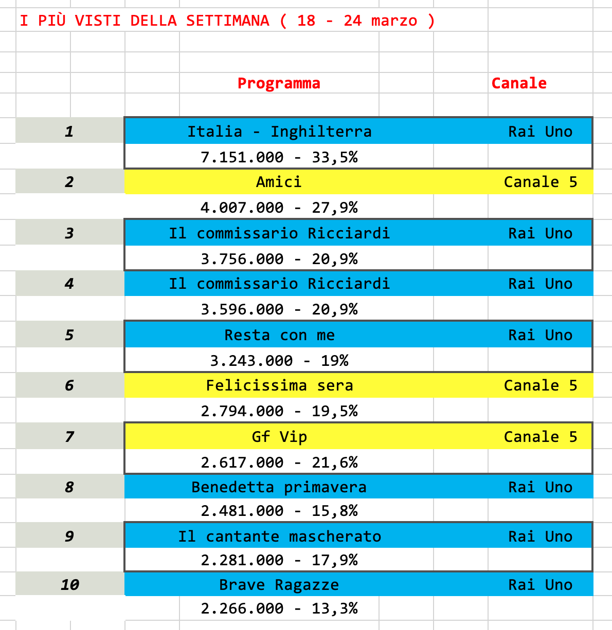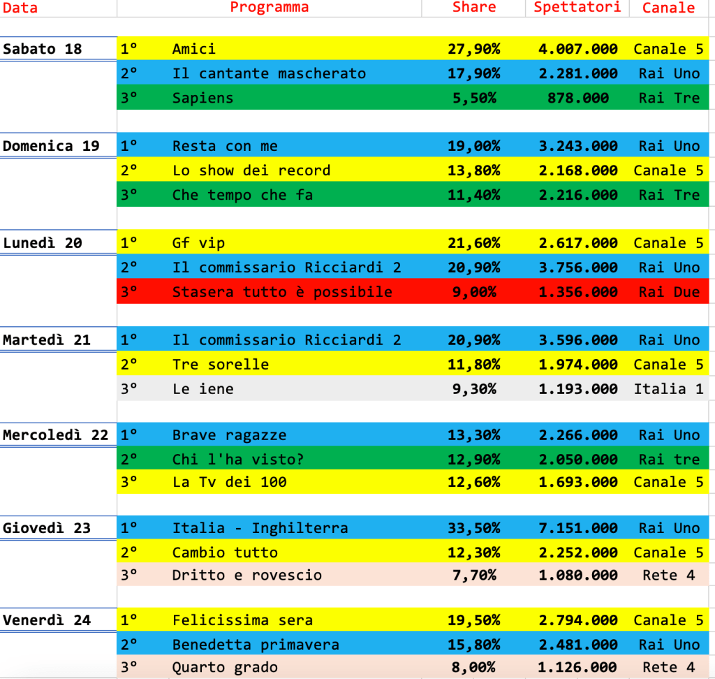 Al primo posto la partita della nazionale contro l’Inghilterra per le qualificazioni ai prossimi europei. Secondo posto per la prima puntata del serale di Amici (sabato 18). Secondo e terzo posto per le puntate finali de Il commissario Ricciardi 2 che nell’appuntamento del martedì riesce a vincere anche in termini di share (invariato rispetto al giorno precedente).