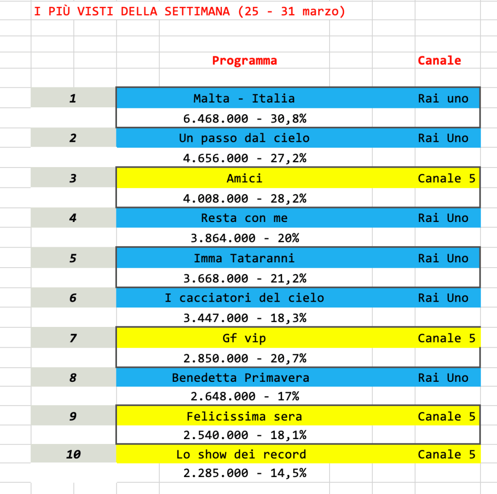 Per il resto tutto più o meno come al solito, con buoni ascolti per Stasera tutto è possibile e le serate di Rai Tre. Quasi testa a testa tra Felicissima sera e Benedetta primavera, una sorta di guerra tra i poveri.