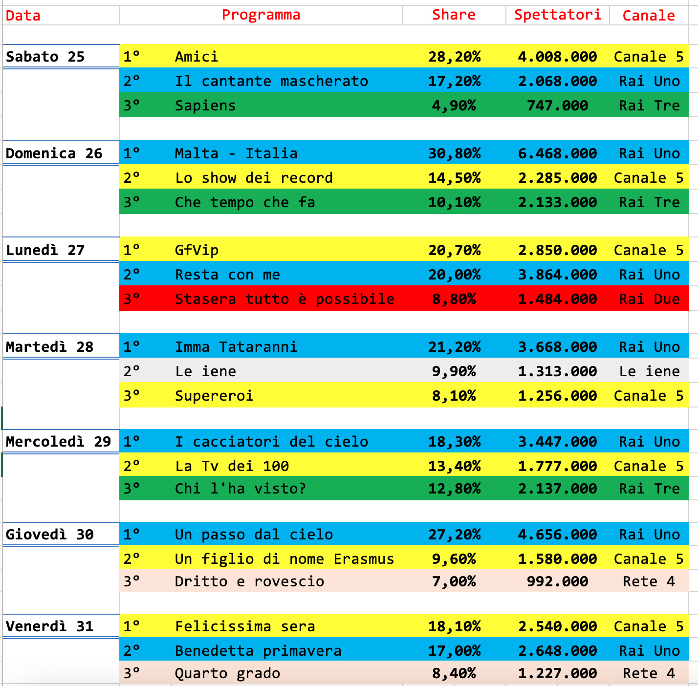 Per il resto tutto più o meno come al solito, con buoni ascolti per Stasera tutto è possibile e le serate di Rai Tre. Quasi testa a testa tra Felicissima sera e Benedetta primavera, una sorta di guerra tra i poveri.