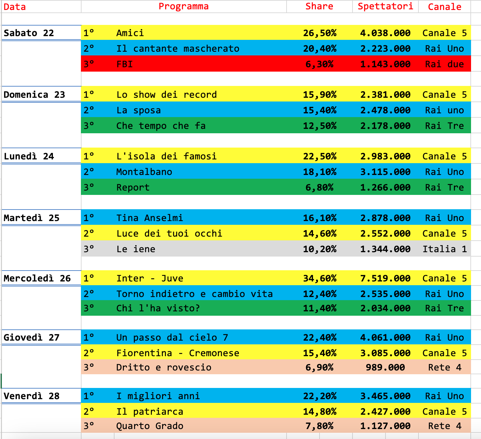 Metà classifica la X replica de Il commissario Montalbano. Ancora Calcio al settimo posto, seguito da L’isola dei famosi che si ferma poco sotto la soglia dei 3 milioni di spettatori. Al di sotto delle aspettative Tina Anselmi. Nella media Luce dei tuoi occhi.